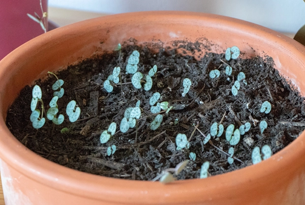 Dazu holte ich aber auch alle Knollen, die die Ceropegia im Laufe der Jahre bildet, dicke wie dünne, aus der Erde und machte eine reine "Knollenschale". Nur Erde rein und die Knollen untergebuddelt. Und hey: Nach ein paar Tagen zeigten sich erste Blättchen! Das ist natürlich meilenweit von dem entfernt, was ich vorher hatte, aber wer weiß, was im Laufe der nächsten Wochen noch so alles an Pflänzchen aus der Erde kriechen wird. Hübsch ist es jedenfalls allemal, wenn aus "reiner" Erde plötzlich diese kleinen Blättchen hervorkommen.