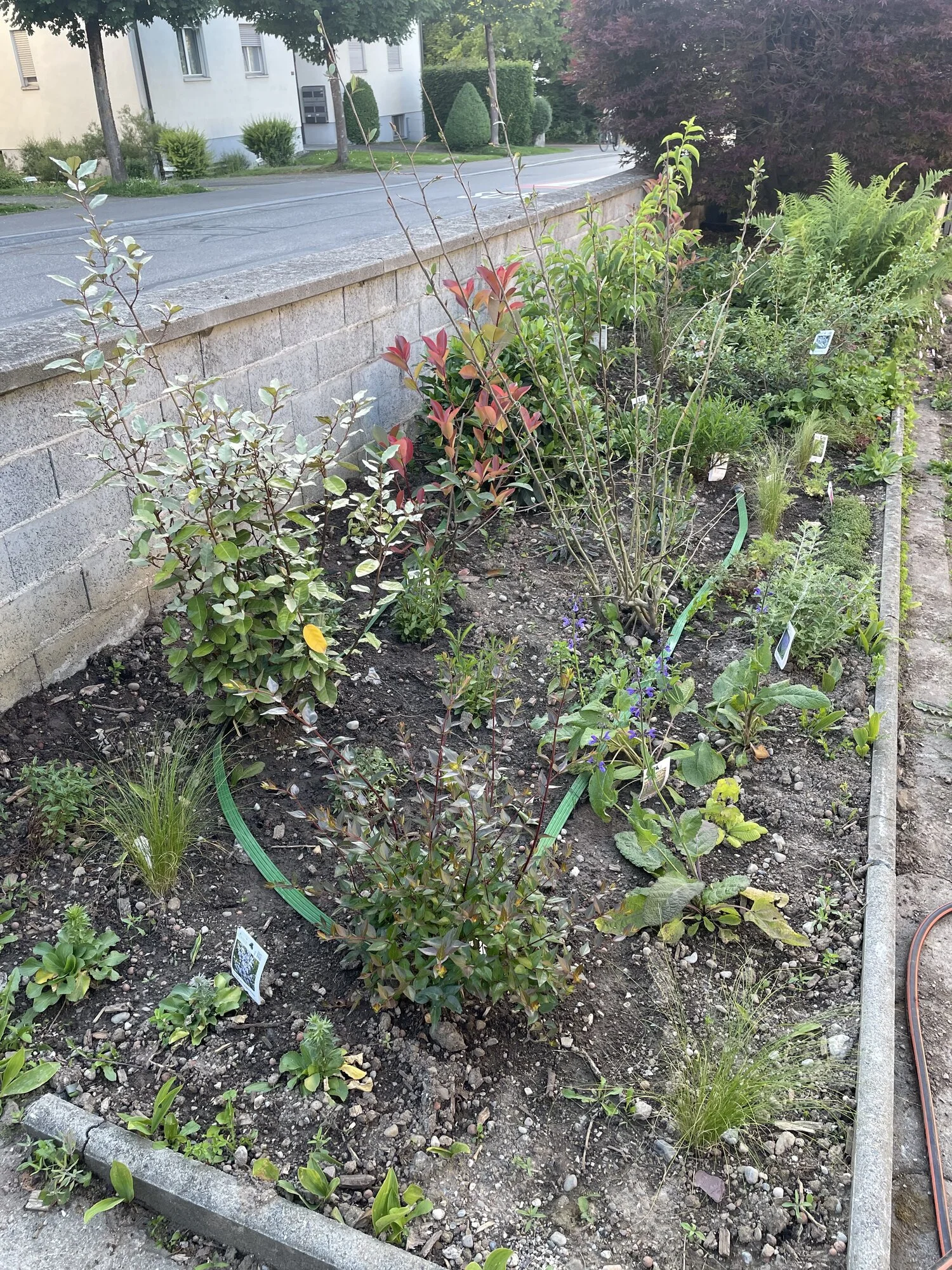 Unsere Hecke ist gesetzt. Sie besteht aus ganz vielen verschiedenen Pflanzen. Was durchkommt, soll gedeihen, wer es nicht schafft, wird entweder nochmals umgesetzt oder muss halt selber schauen, wie er es macht. Die Hecke ist mit vielen Stauden durchsetzt. Auch da soll sich etablieren, was mag.