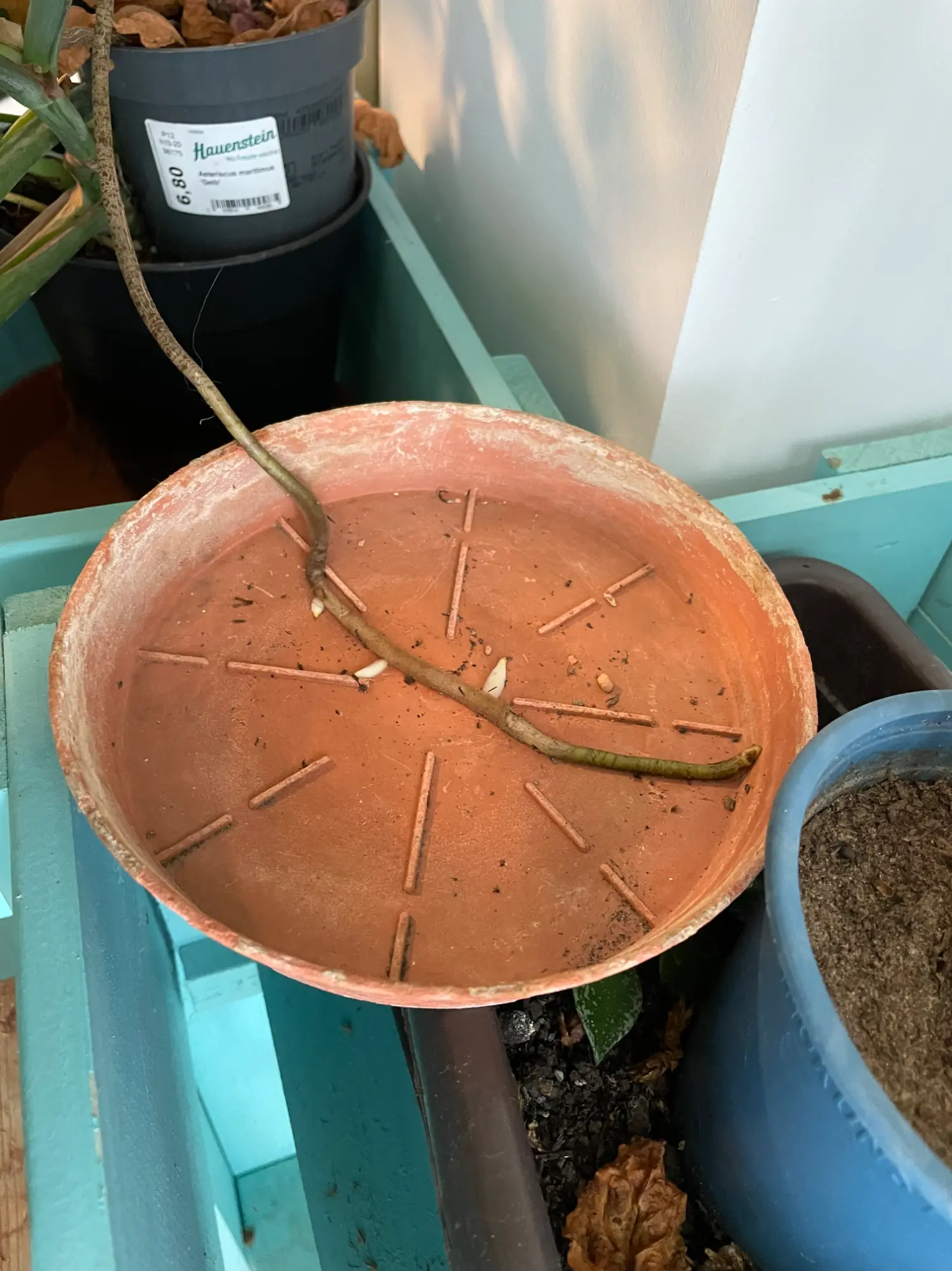 Da hat sich von mir unbemerkt eine Luftwurzel der Monstera unter den Topf geschoben und sich da breit gemacht.