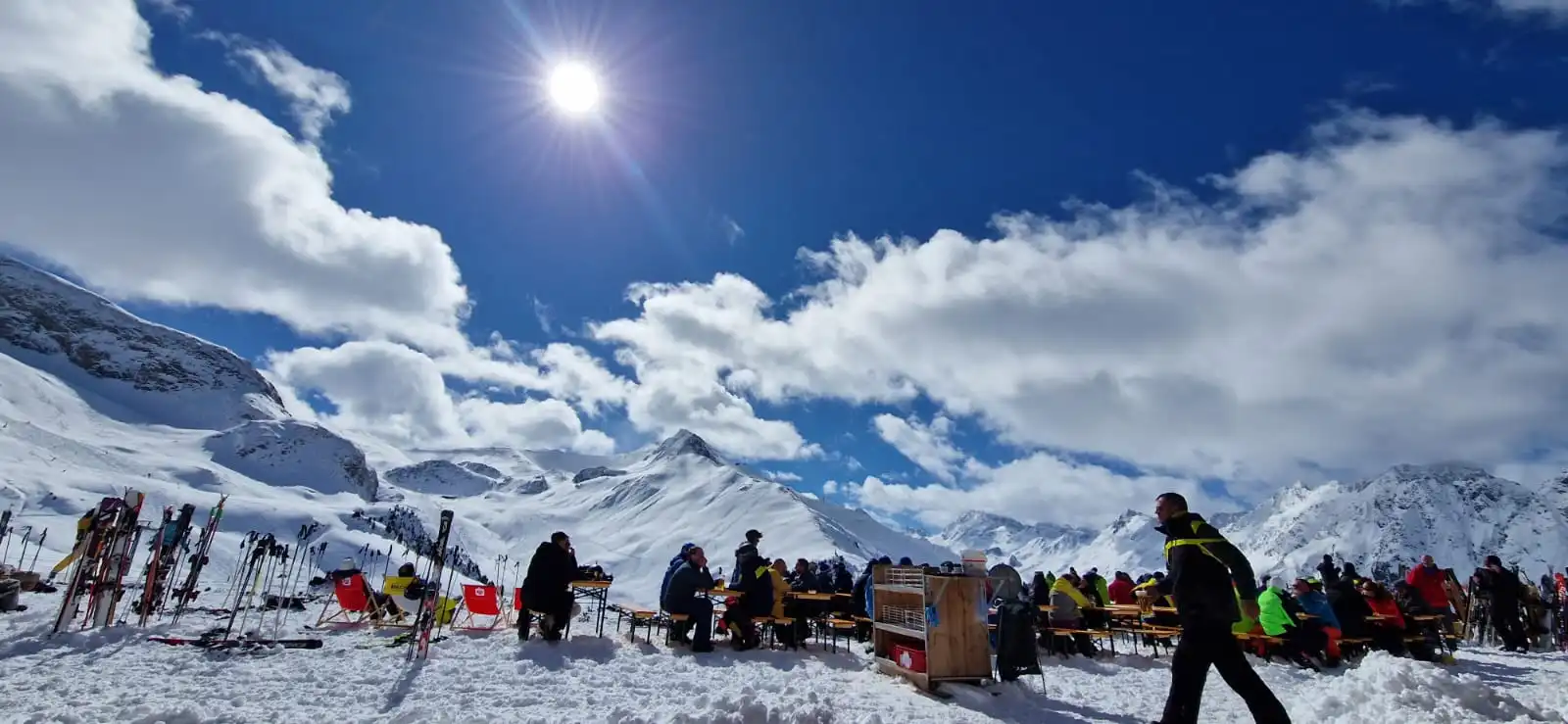 • Wow, was'n blauer Himmel! Sieht nach zauberhaftem Skiwetter aus. Sogar das Büffetmöbel hat Skier drunter, falls ich das richtig sehe, und die Menschenmengen scheinen ja noch im erträglichen Bereich zu liegen. Dann war's sicher auszuhalten, hm? Jeden Tag Muskelkater, hoffe ich mal! :giggle: