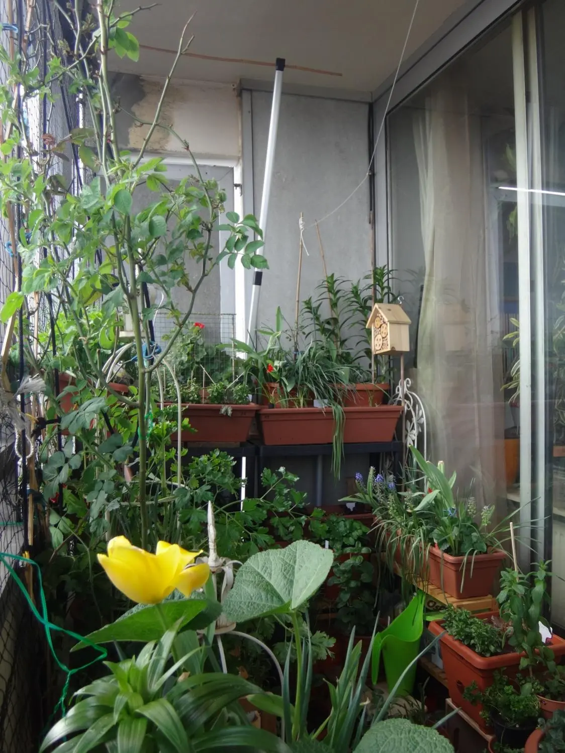 Trotz des Regens öffnet sich mutig die gelbe Tulpe, obwohl sie nahe am Geländer steht und somit den Regen abkriegt. Wenigstens ein Stückchen Farbe in dem tristen Allerlei.