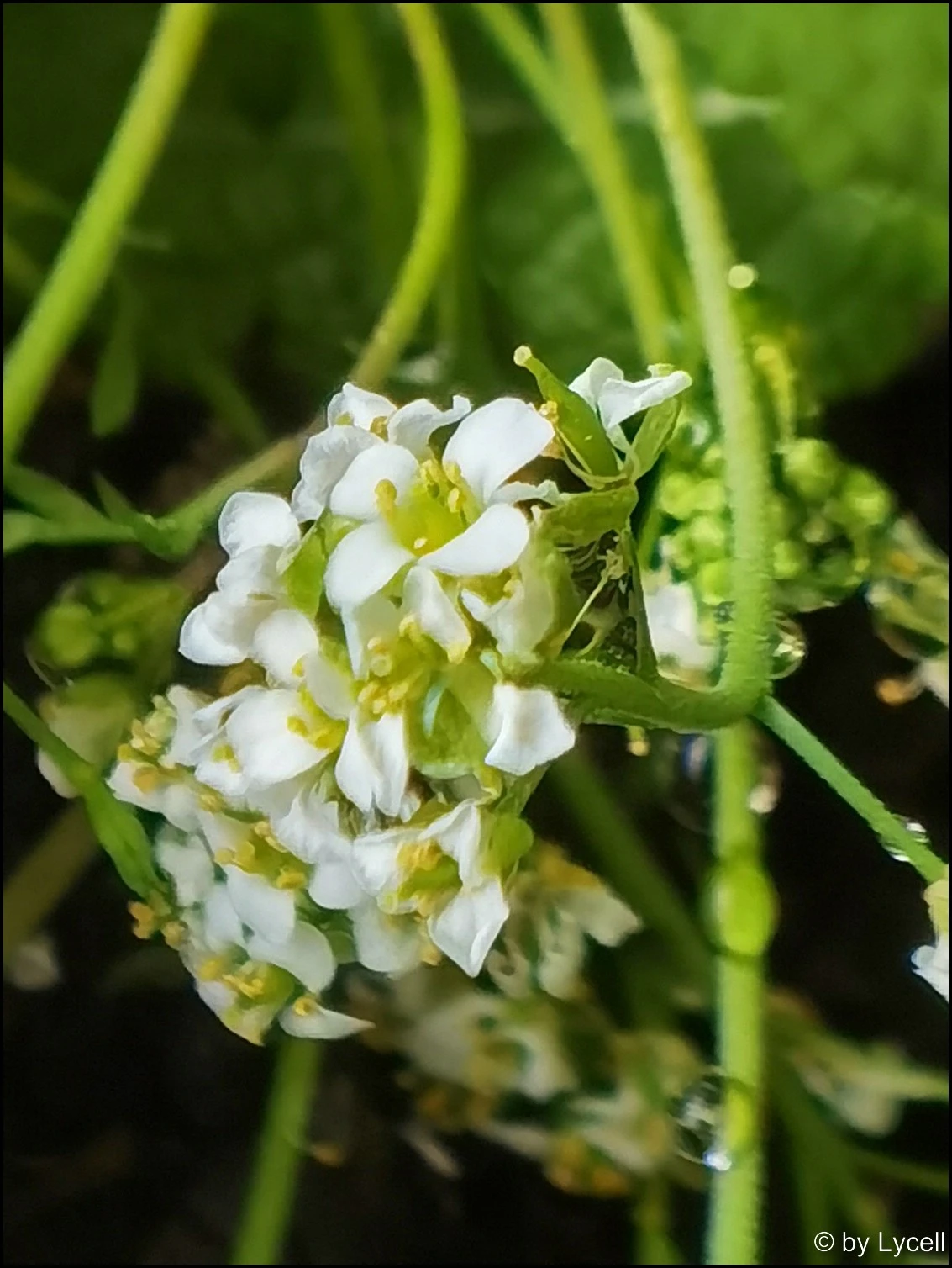 Irgendeine kleine Polsterstaude blüht ein wenig vor sich hin und trotzt dem Aprilwinter.