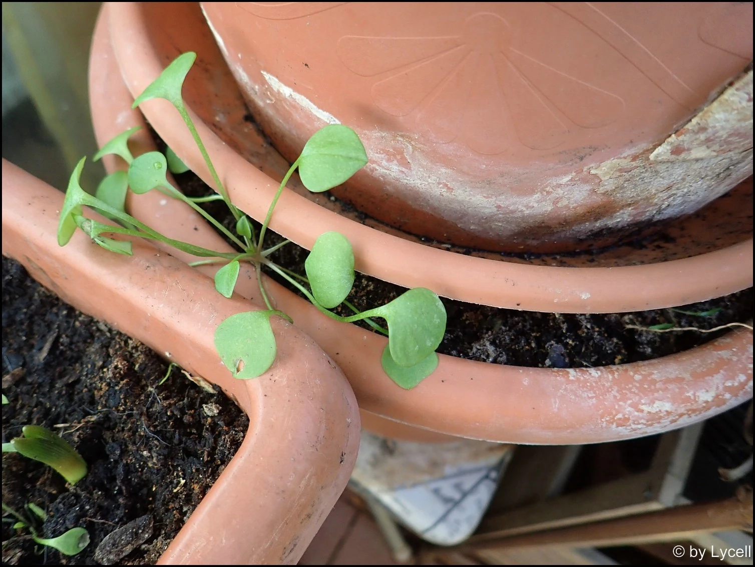 Komischerweise freut sie sich grad, wenn irgendwo was wächst. Ist im Frühling doch normal. Wenn was Grünes zwischen gestapelten Pötten erscheint, ist es das also auch, egal, ob der Frühling noch fehlt.