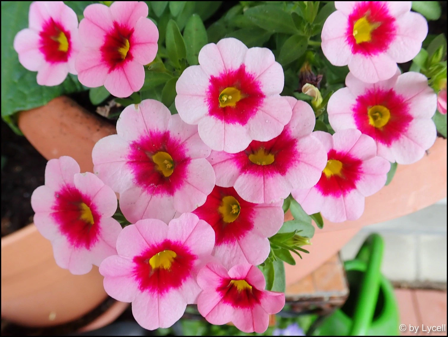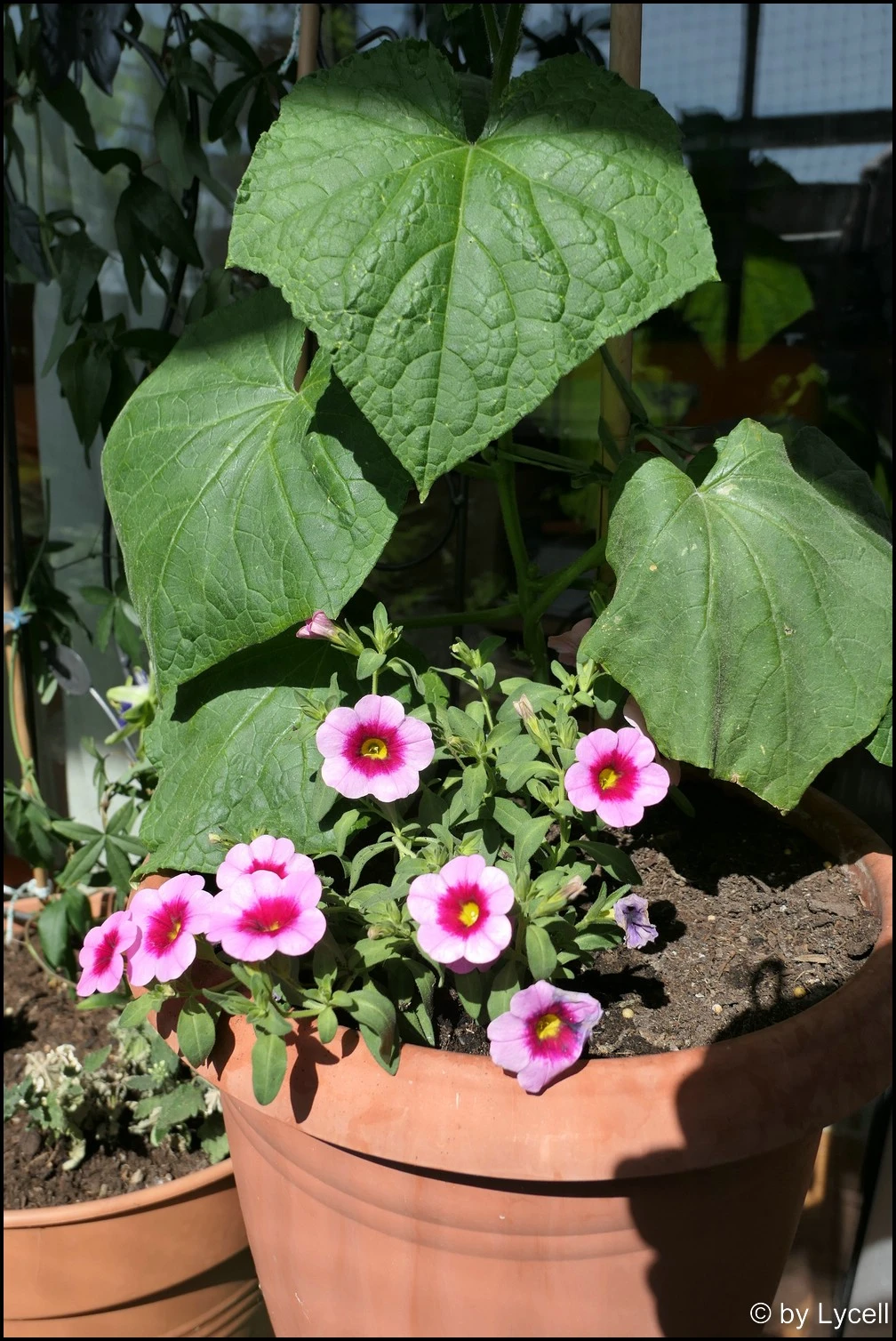 Das Zauberglöckchen zu deren Füßen fühlt sich sichtlich wohl. Schon komisch, alles, was in den Reservoirtöpfen sitzt, gedeiht. Bei allem anderen gieße ich meist zu wenig oder zu viel, jedenfalls passt es nie ganz. Wobei es Pflanzen gibt, denen alles egal ist - wie die Sunberry, die wild im Spalt keimte und nun blüht und auch schon erste Früchtchen bildet.