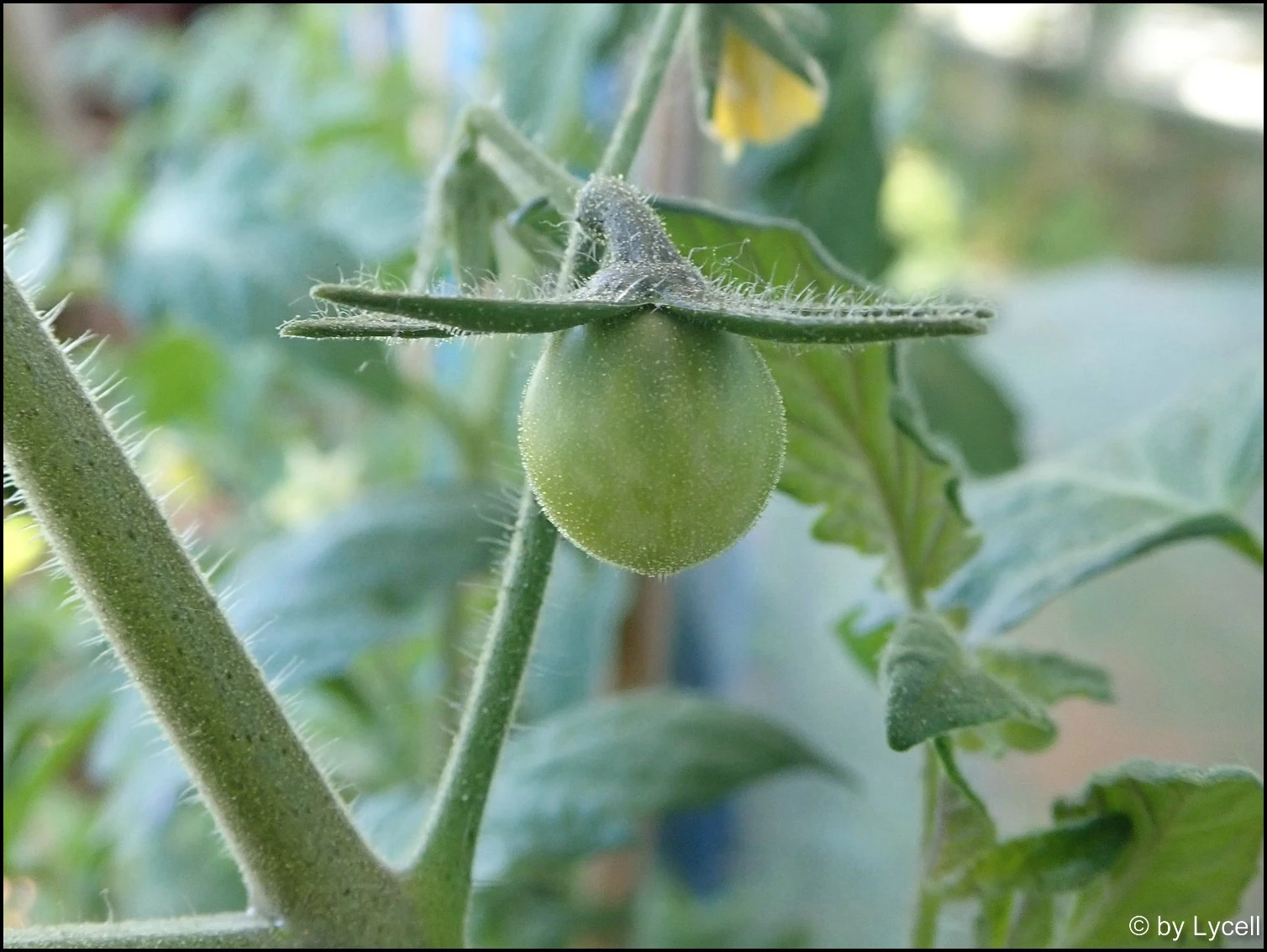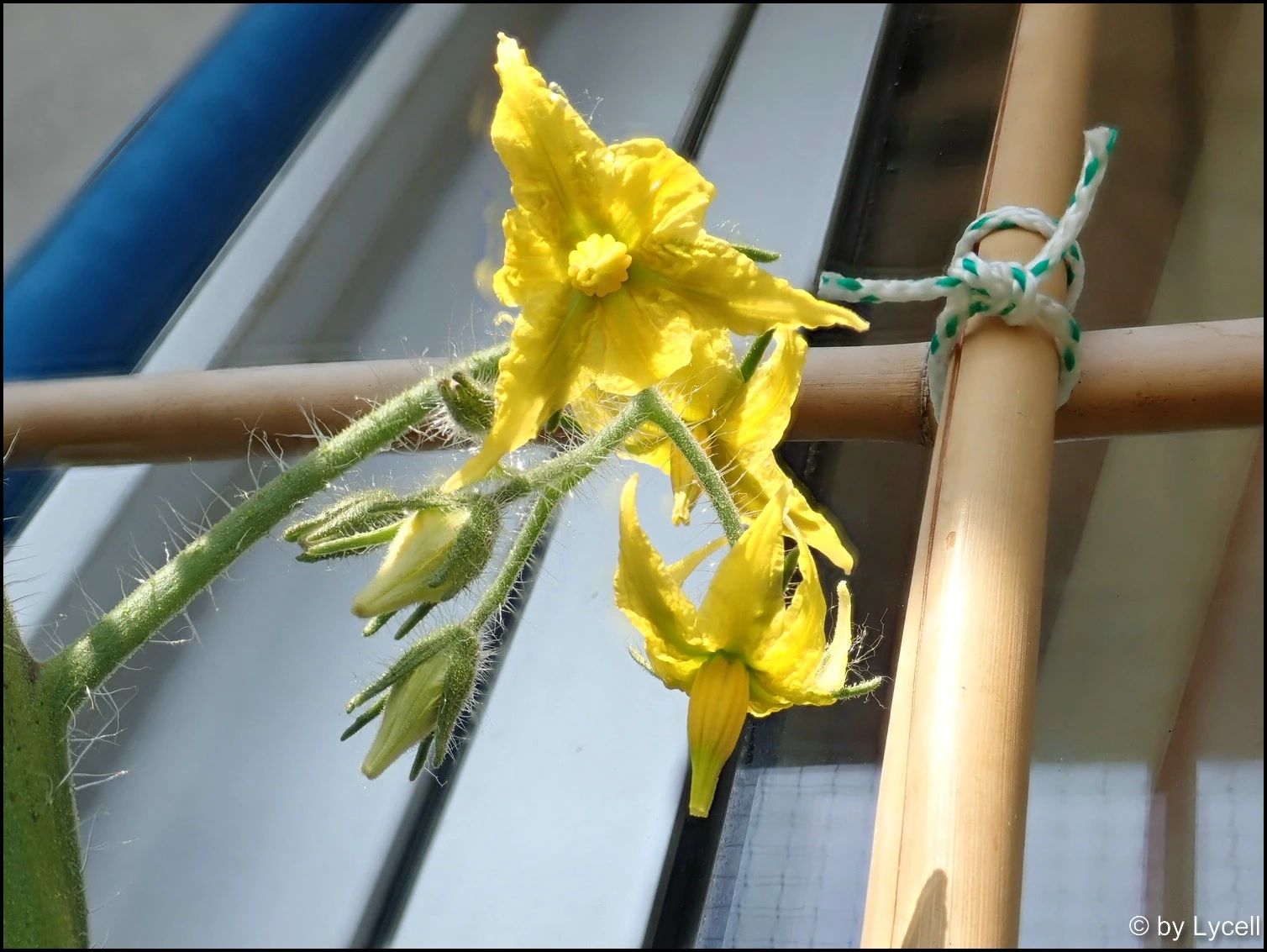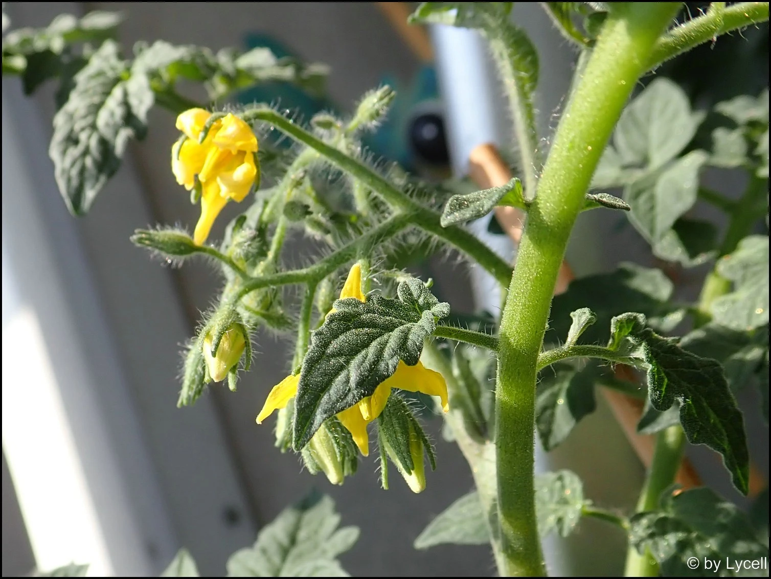 Tomatenwand ist noch keine Wand, aber immerhin hab ich doch wegen des drohenden "Sturmes" mal einige anbinden müssen. Sie wachsen also doch! Und die Tumbling Tom in der Ampel zeigt die erste Blüte. Noch steht sie aufrecht.