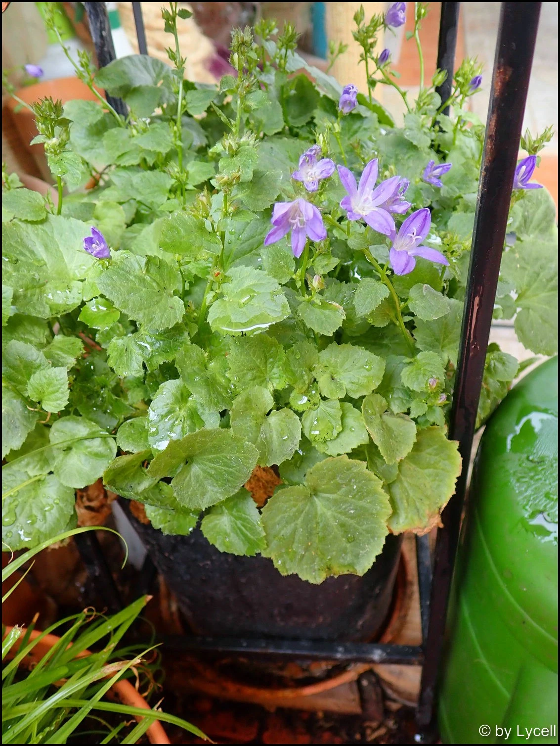 Direkt unter dem Hocker der Aldigurke sitzt seit Jahren die Glockenblume, die jetzt auch blüht. Der Sommer ist wirklich angekommen. In der Schale neben dem Tisch strahlt ein Fettblatt im Sonnenschein, bei dem ich jeden Winter denke, es sei tot. Weiß wer, die die Pflanze wirklich heißt?