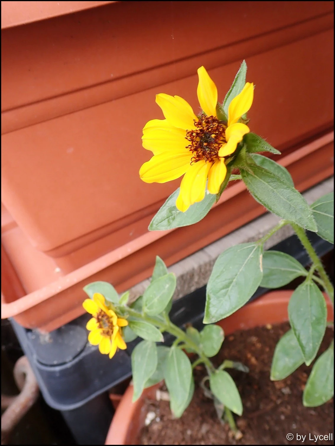 Hihi, Dosi mag Sonnenblumen. Hat dieses Jahr sogar selbst welche gesät. Sie meinte, die bleiben klein und passen auf Balkonien. Ja, da hat sie recht. Die Dinger sind winzig und keineswegs beeindruckend. Da hätte sie besser Katzenminze gepflanzt.
