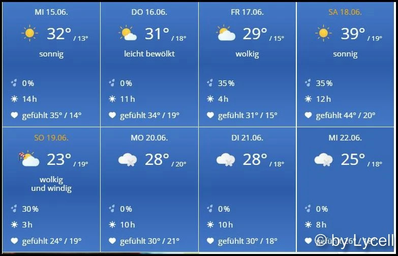 Noch ist es schön kühl mit 23°. Die Sonne kommt ja erst in 1,5 Stunden um die Ecke. Bin gespannt, wie viel Hietze sie zustande bringt.