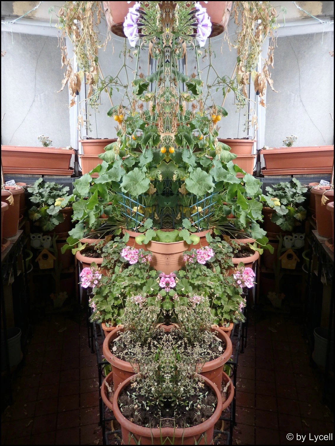 Wegmachen mag ich die noch nicht. Sie blühen immer noch; sogar die, welche ich ganz abgeerntet hatte. Und eine schlängelt sich an der Decke entlang, wo vor Monaten die Gurke wucherte.