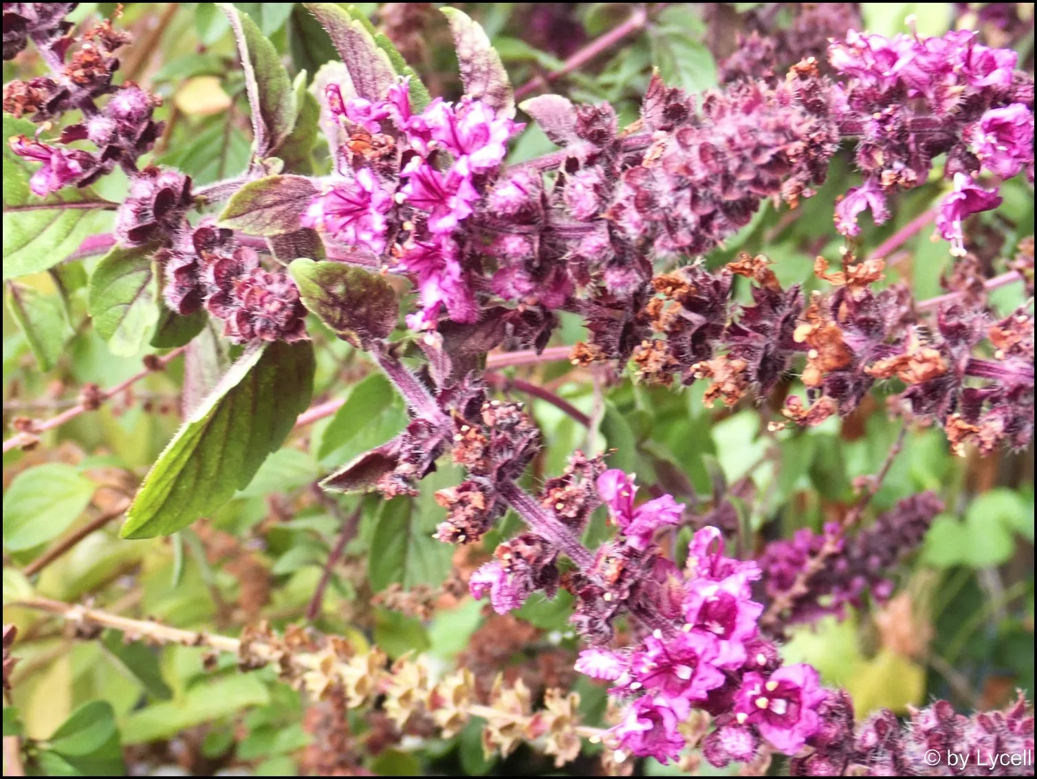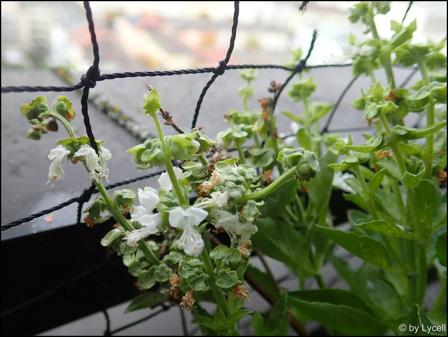 Auf der anderen Seite, vor dem Wohnzimmer, dominiert das Strauchbasilikum, dem ich im nächsten Jahr die ganze Fläche zugestehen will. Auf meinem heißen Balkon gibt es nicht vieles, das so ausdauernd blühen mag. Na ja, die Stockrosen gehören auch dazu - da hab ich inzwischen drei wild versamte Pflänzchen entdeckt, die im nächsten Jahr dann blühen wollen.