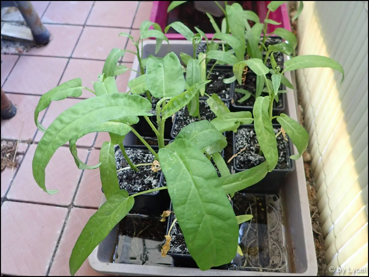 Wasserspinat - die größeren habe ich etwa drei Wochen vor den anderen gesät, weil die auswachsen und blühen sollen. Aber sie passen schon nicht mehr unter die Lampe.