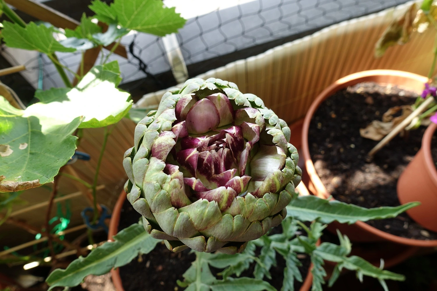 Meine Artischocke soll blühen. Hab ihr versprochen, dass sie niemand essen wird. Bin gespannt, ob sie überhaupt Leben zeigt. Der Wurzelballen war total vertrocknet und so weit ich weiß mögen Artischocken gerne viel Wasser. Nun ja, abwarten - auf alle Fälle sieht sie gut aus mit ihrer großen Knospe.
