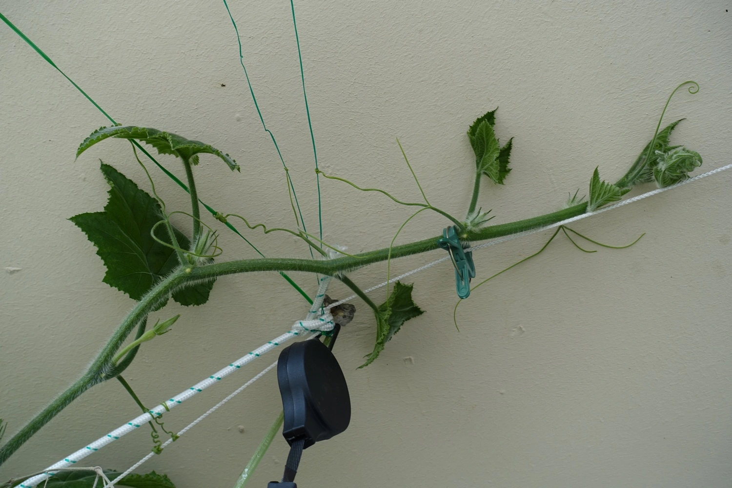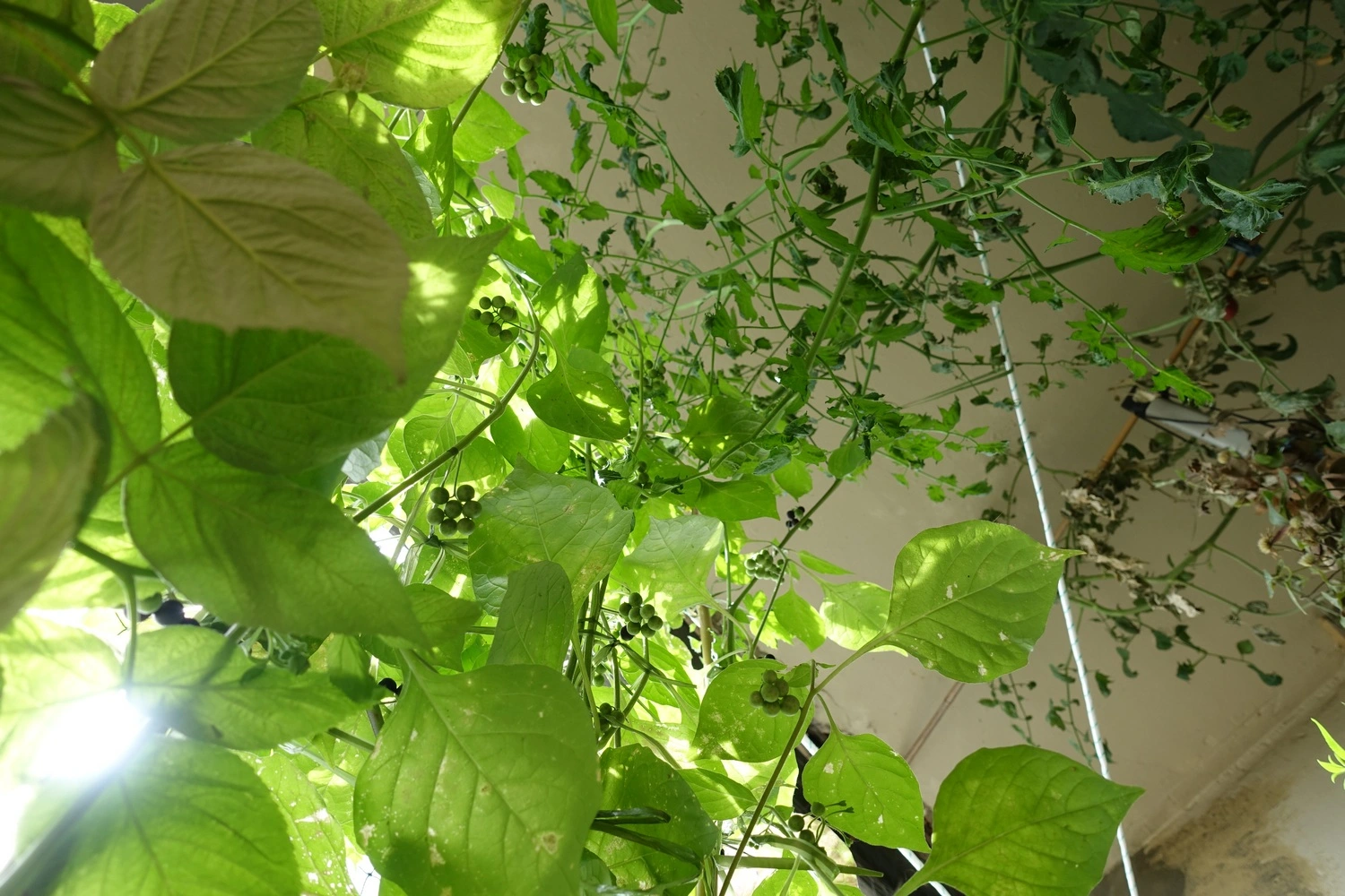 Die Trombonchino ist ja längst an der Decke angekommen und schlängelt sich nun immer weiter im Versuch, die Eingangstüre zu erreichen. Bisher gab es aber nur männliche Blüten. Überhaupt ist die breitere rechte Seite inzwischen auch deckenmäßig begrünt. Gefällt mir gut.