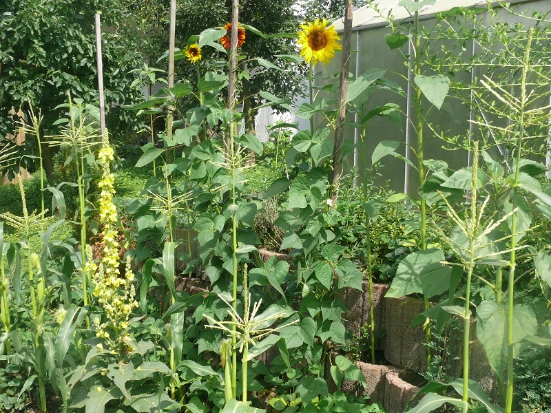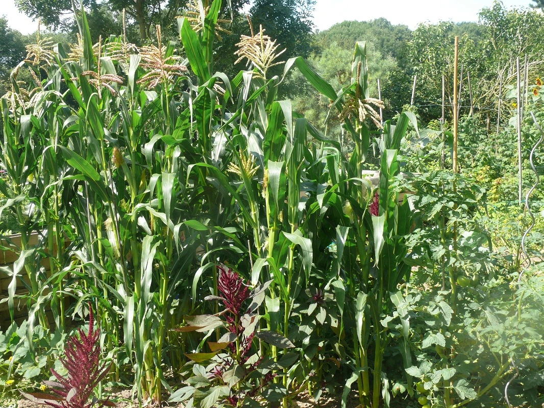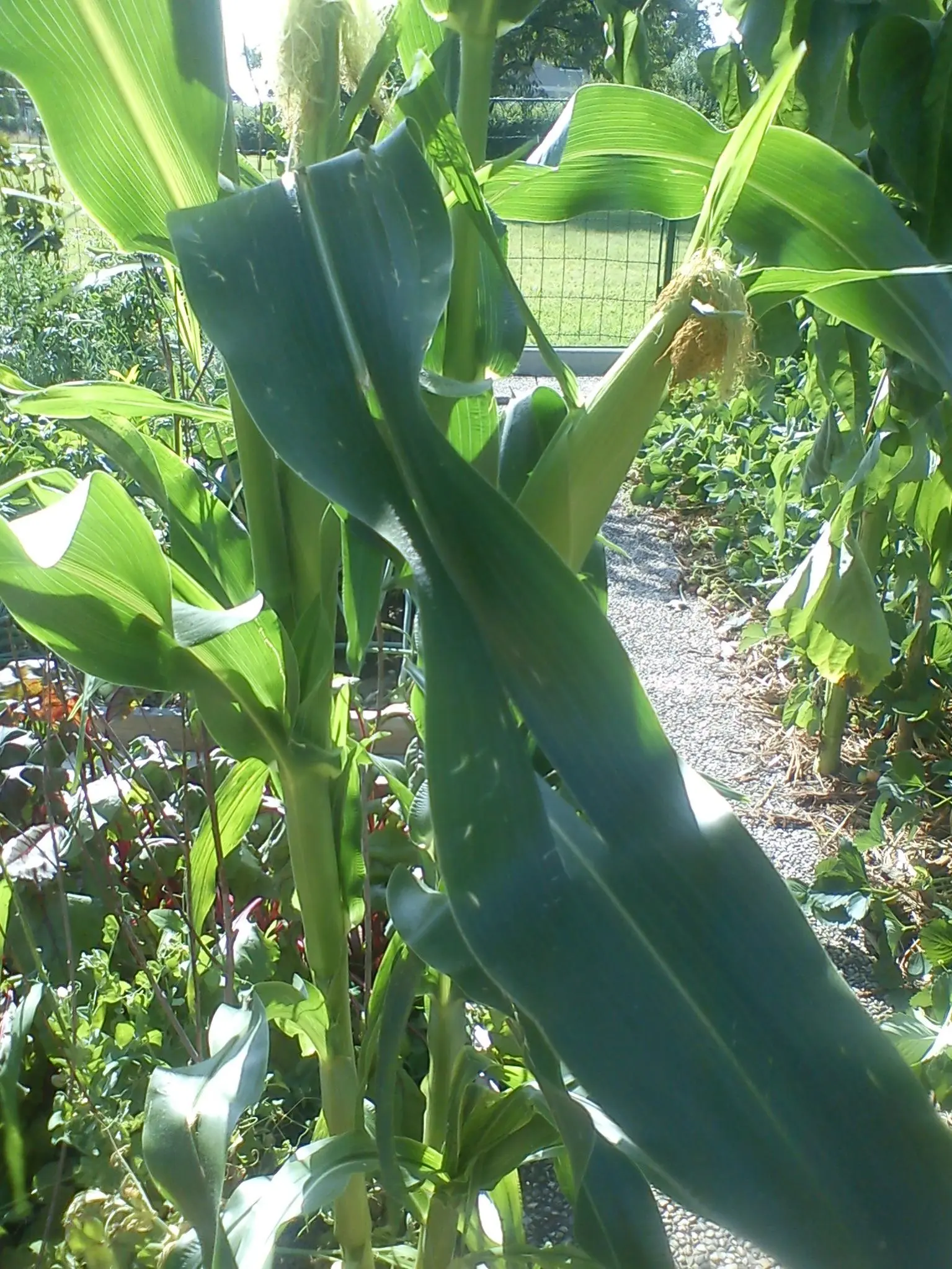 Ich habe 5 Maispflanzen im Garten, die größte ist 1,6m. Die Kolben müssten bald essbar sein.