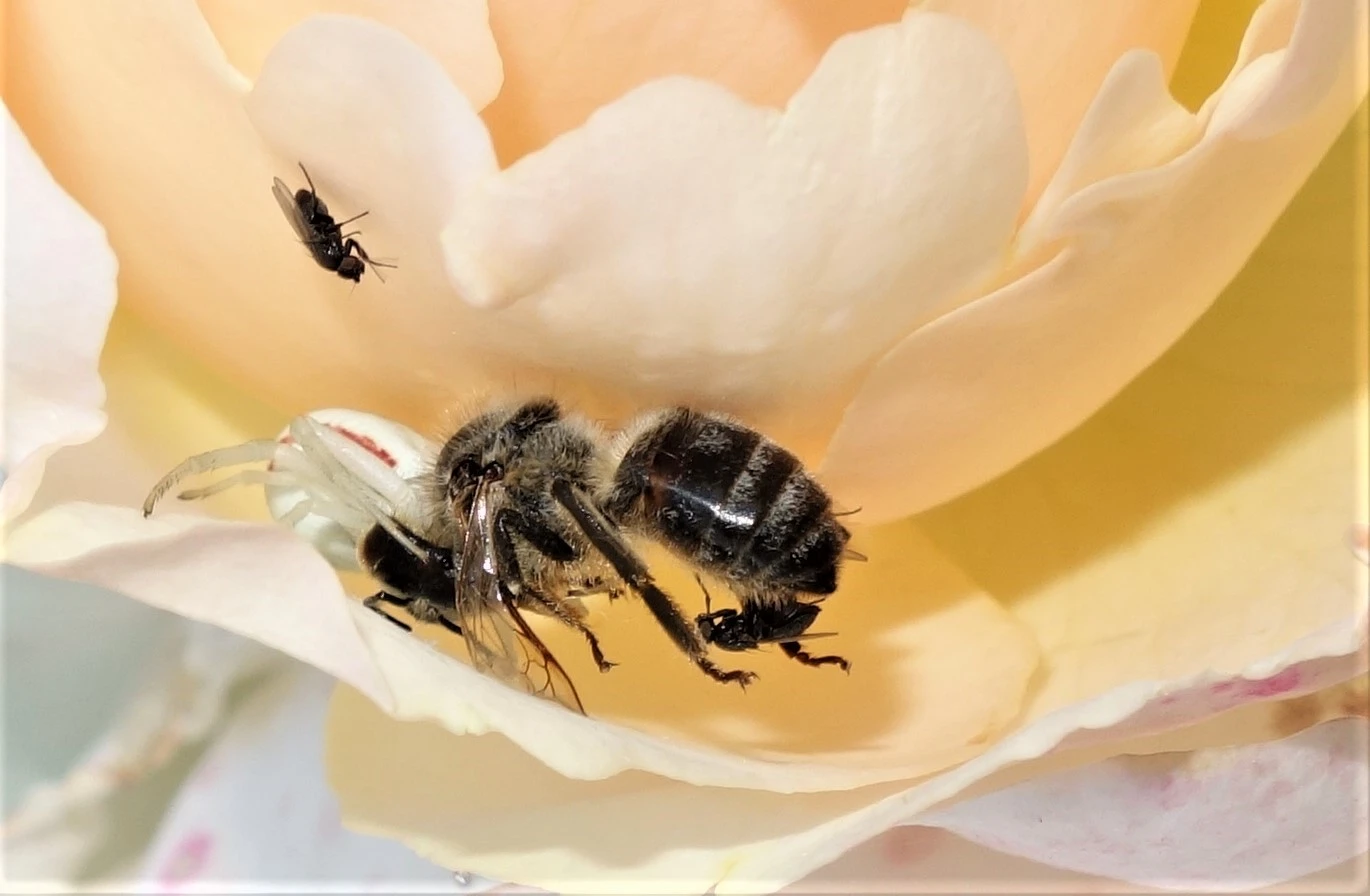 Ich mag diese brutalen Krabbenspinnen einfach nicht. Aber die beiden kleinen Gaffer in Fliegenform sind kein bisschen besser ...