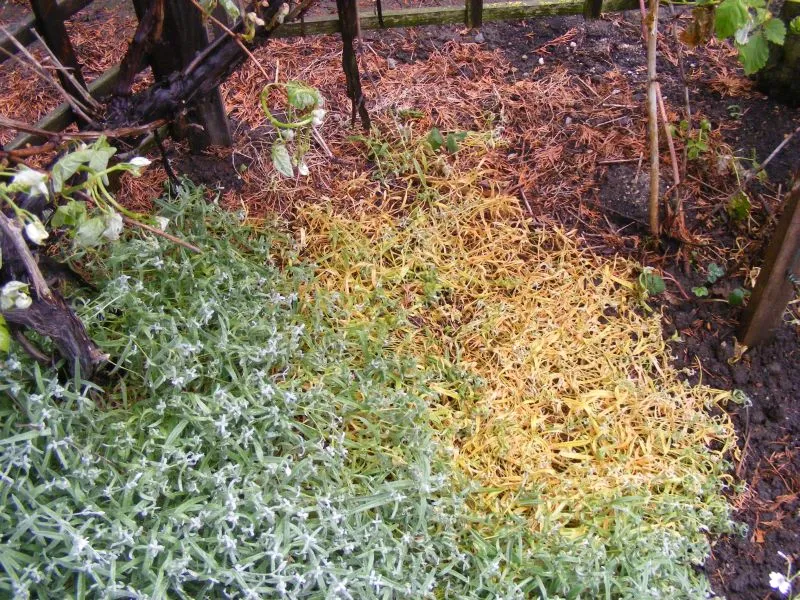 • Man sieht genau, wo jemand in den Garten gekkommen ist, in das Hornkraut getreten(eine andere Stelle als auf dem Foto), dabei den Deckel von der Tonne geschubst, in den Koniferenast getreten, diesen mitgeschleift bis in diese Niesche, wo er jetzt liegt und dann am Schuppen vorbei, den Strauch abgebrochen.