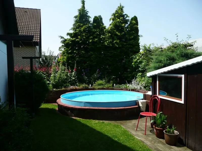 • Der Pool ist auf der dem Nachbarn zugewandten Seite eingelassen. Keine Ahung, ob man an der Wandung was anschweißen könnte. Sie ist aus so einem dünnen biegbaren Blech und dieser Handlauf, der die Folie hält ist auch nicht sehr stabil. Aber man könnte ein Sonnensegel irgendwie, die Betonung liegt auf IRGENDWIE, am Schuppendach anbringen.