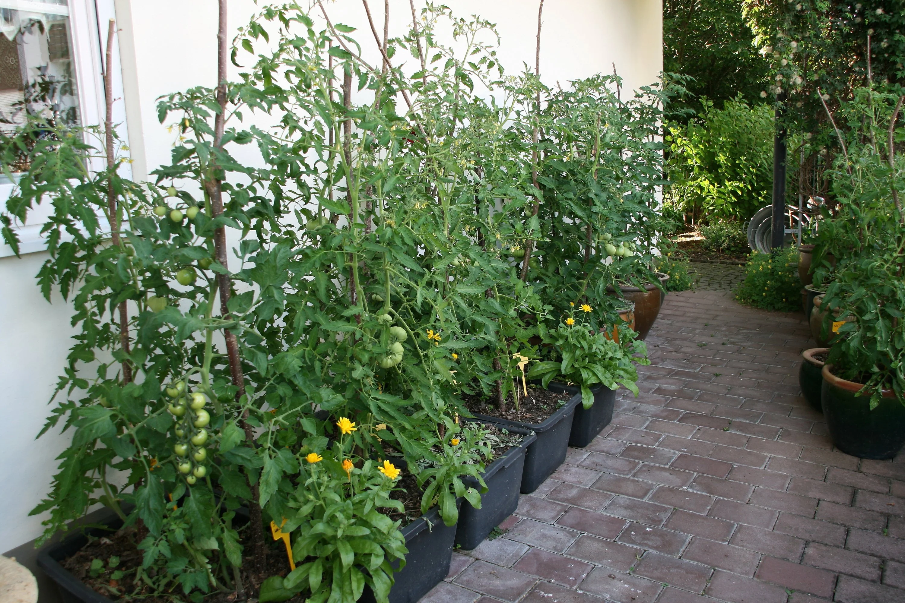 Für Tomaten habe ich so einen trockenen Standort bekommen, die stehen unter dem Balkon und bekommen von oben keinen Regen. Habe ja kein Glashaus. Ich habe lehmige Erde mit Kompost vermischt. Das heißt ich lasse die Erde auf Dauer da drinnen und verbessere sie nur im Frühling mit Kompost und Terra-Preta. Außerdem habe ich noch mit EM getränkte Schafwolle vergraben, das ist praktisch ein Langzeitdünger. Von der Schafwolle ich im Herbst nichts mehr zu sehen. Ich habe mit diesen Mörtelwannen nur die besten Erfahrungen gemacht. Oben drauf mulche ich immer mit Rasenschnitt, damit kein Unkraut wächst und die Erde bleibt länger feucht.