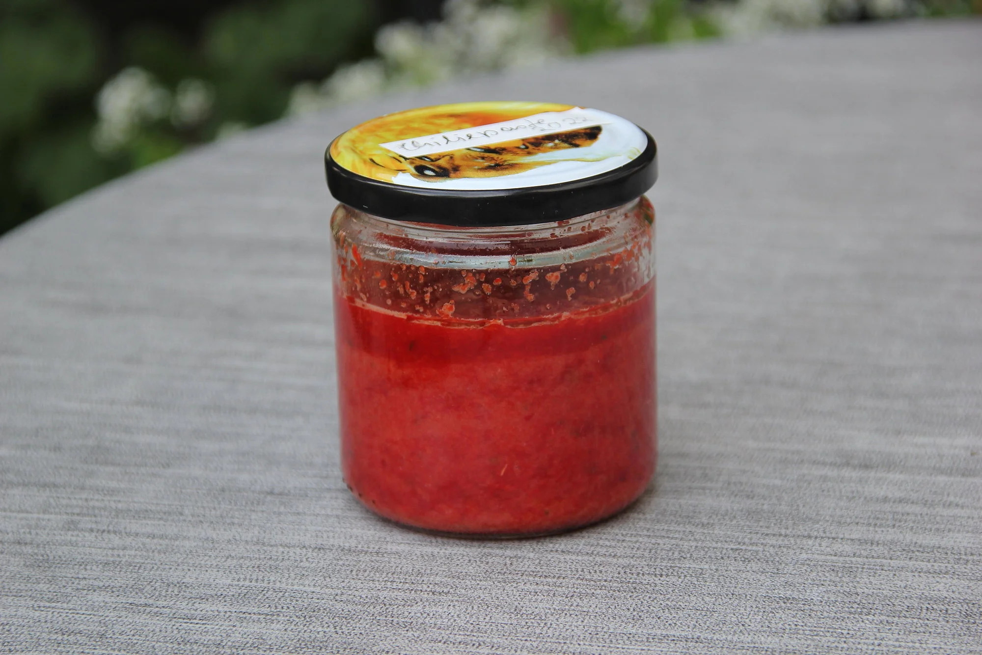 Heute habe ich Chiliepaste gemacht. Die rohen Chilies gewogen, es waren 196 g, dann habe ich 196 Salz gewogen und alles zusammen gemixt. Das ist diese Menge geworden im Glas. Das in den Kühlschrank gestellt, damit kann ich z.B.Gulasch, Eintopf, Kartoffelsuppe würzen. Die Chilie sind nur mittelscharf, das hält sich jahrelang, da mache ich schon jahrelang und es hat sich bewährt.