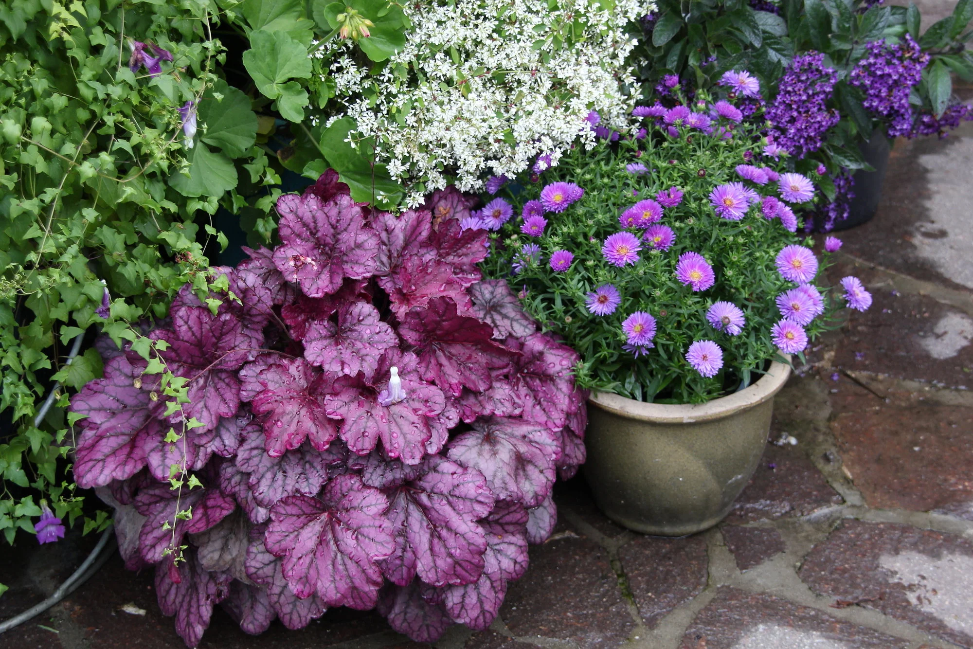 Das ist eigentlich was einjähriges, das gibt es jetzt im Herbst und im Volksmund heißt das Stacheldraht. Im Herbst kaufe ich das manchmal wo es paßt. Meistens kaufe ich nur Heidekraut als Farbkleks, das schmeise ich dann im Frühling weg. Die anderen Pflanzen versuche ich winterharte zu kaufen,. z.B. Heuchera, Gräser, die ich dann immer wieder verwenden kann. Die tu ich dann aus den kleinen Töpfen, wo sie im Sommer stehen raus und tu sie in die größéren Gefäße zusammenmischen. Die Mühlenbeckias mag ich auch sehr gerne. Die sind ja auch fast winterhart. Die kleinen Blättchen werden später dann fast dürr, dann schneide ich die ganz stark zurück, lasse nur das Herz stehen, die treiben ganz schnell wieder aus und sind den ganzen Sommer schön grün und überall ein Ruhepol.