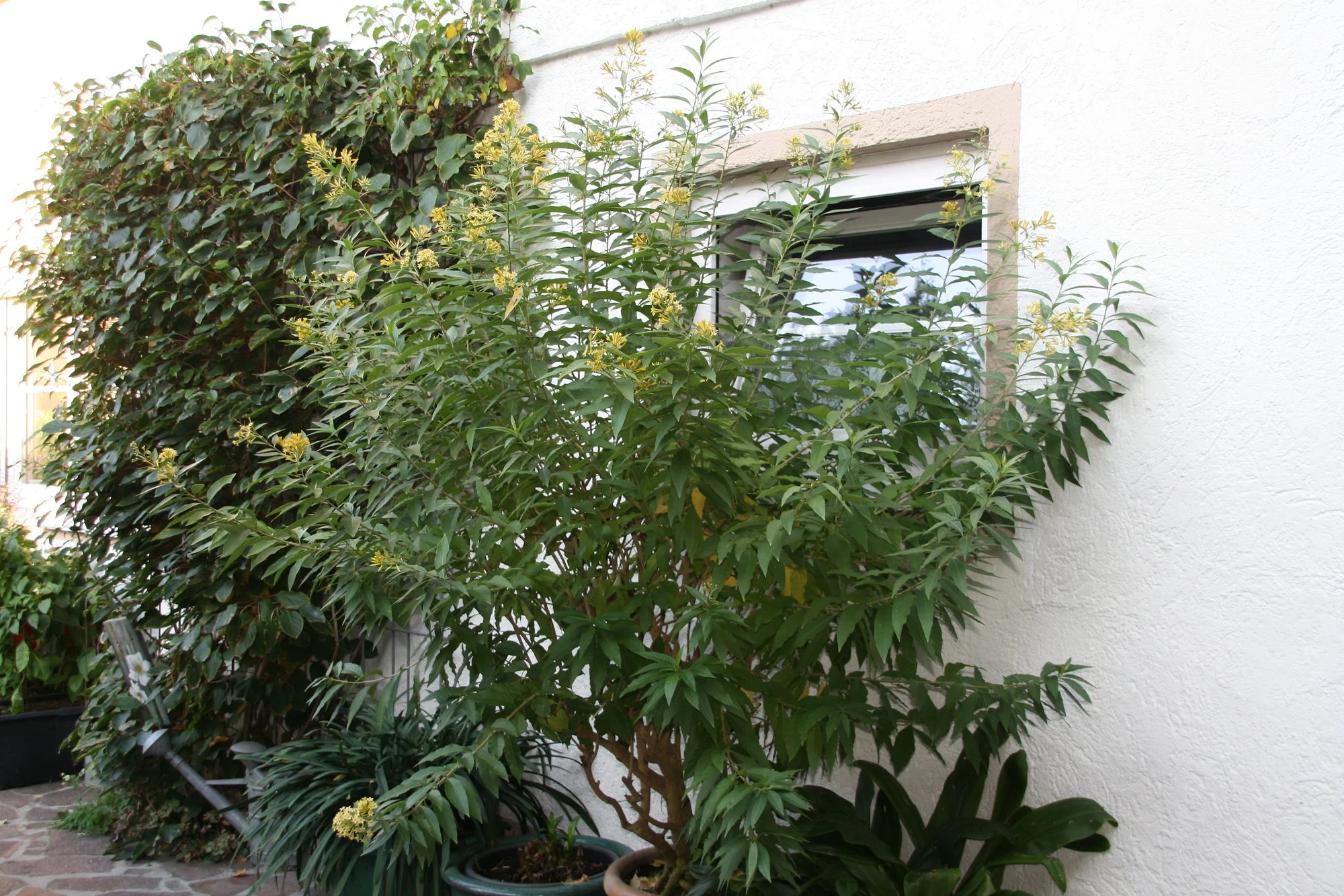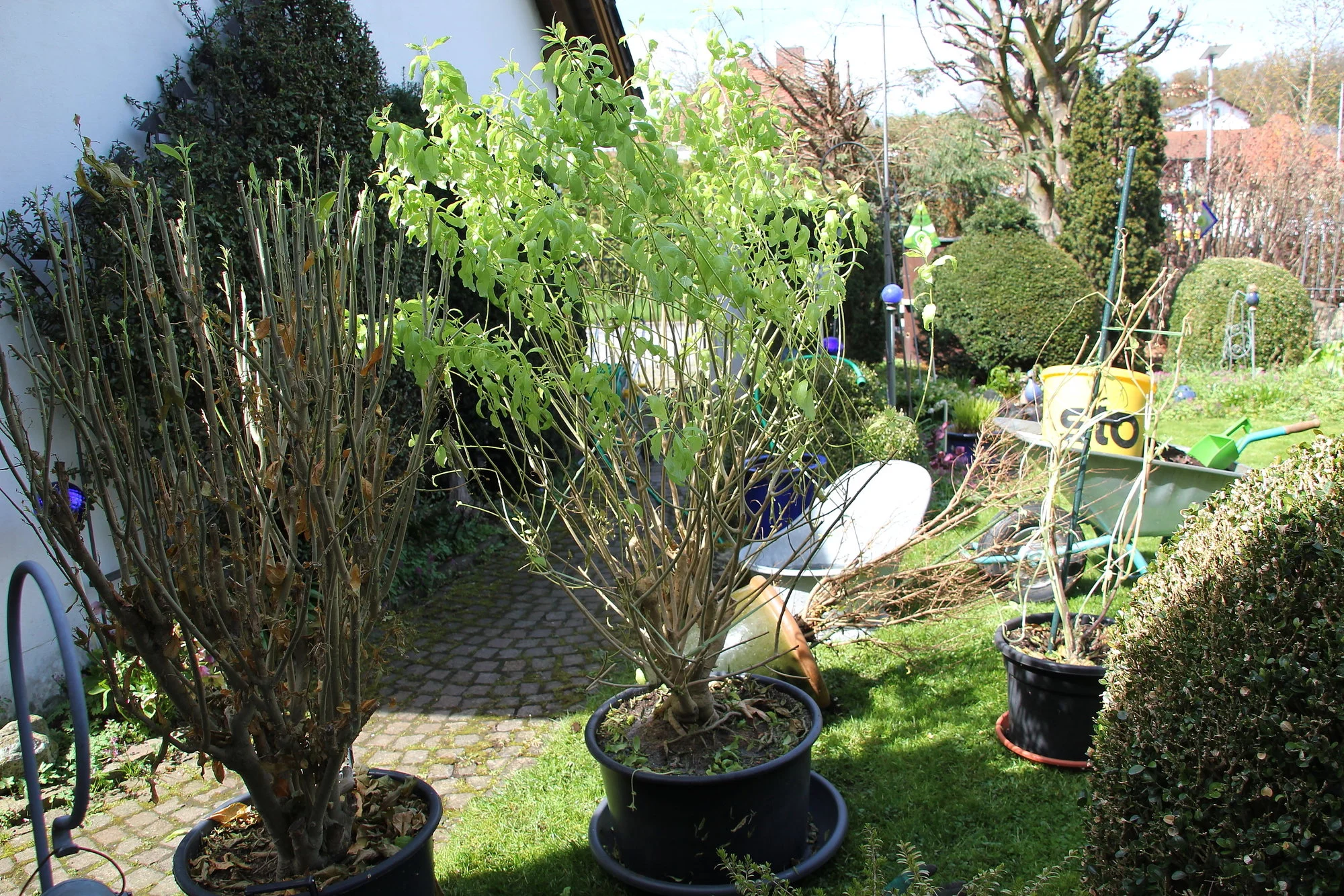 • Die Bilder sind nicht besonders scharf. Die Lichtverhältnisse waren nicht gut, Sonne und Schatten. Bin fast fertig. Nur noch 5 Pelaragonien noch, das mache ich abends. Das waren dann 20 Teile. Zwei große habe ich umgetopft. Einen hellgelben und einen weißen Hammerstrauch. Die habe ich ganz schön zurückgeschnitten. Die werden mir sonst zu groß und zu verholzt. Bilder kommen später. Jetzt scheint voll die Sonne hin. Das erste ist der weiße, das zweite Bild ist der hellgelbe Hammerstrauch. Bekannter ist der rote. Den lateinischen Namen weiß ich jetzt nicht. Der weiße duftet nachts unvergleichlich gut. Da riecht der ganze Garten.