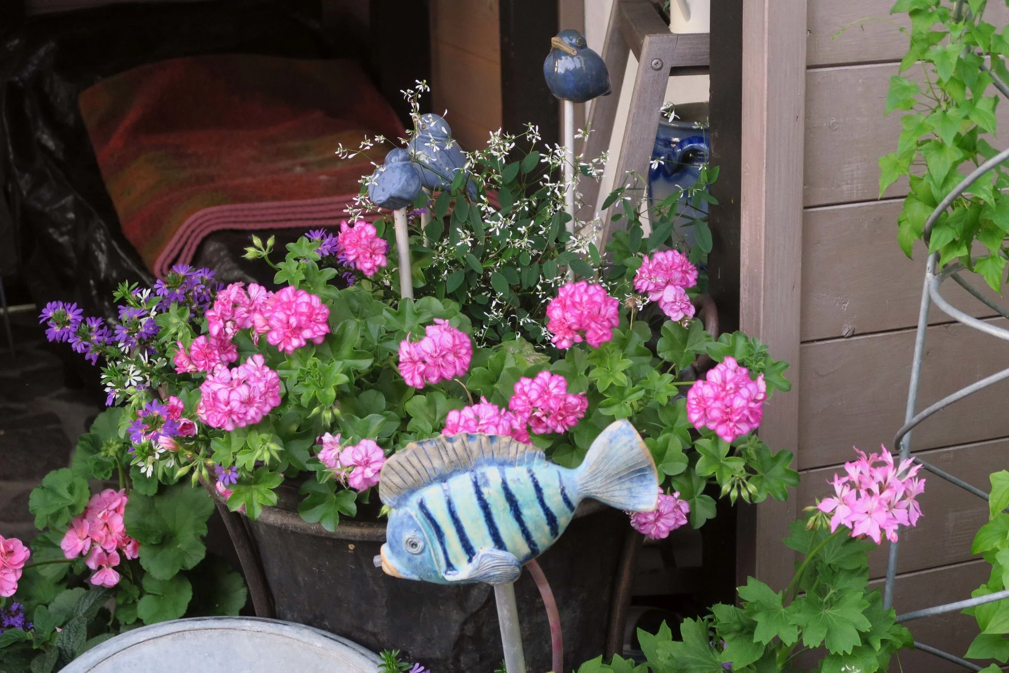 Die hohen Geraniums stütze ich, die niedrigen nicht. Da gibt´s so grünummantelnde Drahtstützen in verschiedenen Höhen. Da habe ich etliche davon daheim, die sind sehr praktisch. Da hat mir mein Schmid eine schöne Stütze gemacht.