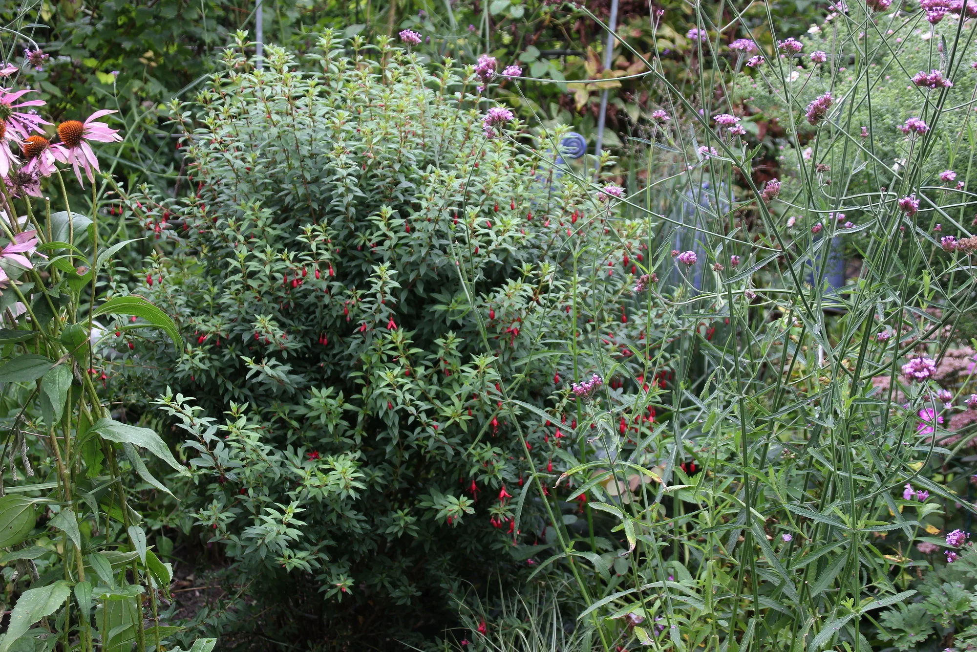 Was machst du mit deinen winterharten Fuchsien im Winter? Ich hab dieses Jahr ja auch eine gepflanzt, ist naturgemäß noch recht klein, blüht aber schon ganz brav. Hätte sie auch gern so buschig wie deine beiden und möchte sie darum nicht gleich im ersten Winter allen mögliche Gefahren aussetzen. (Genauer Sortenname stand nicht dran, nur Fuchsia magellanica.)