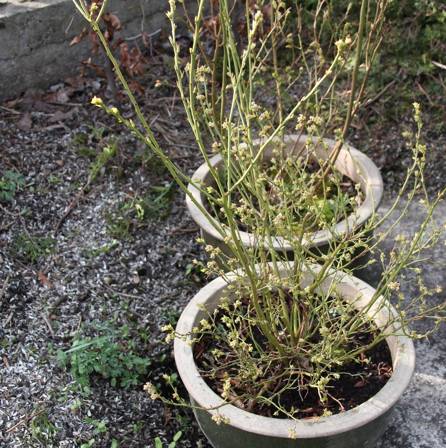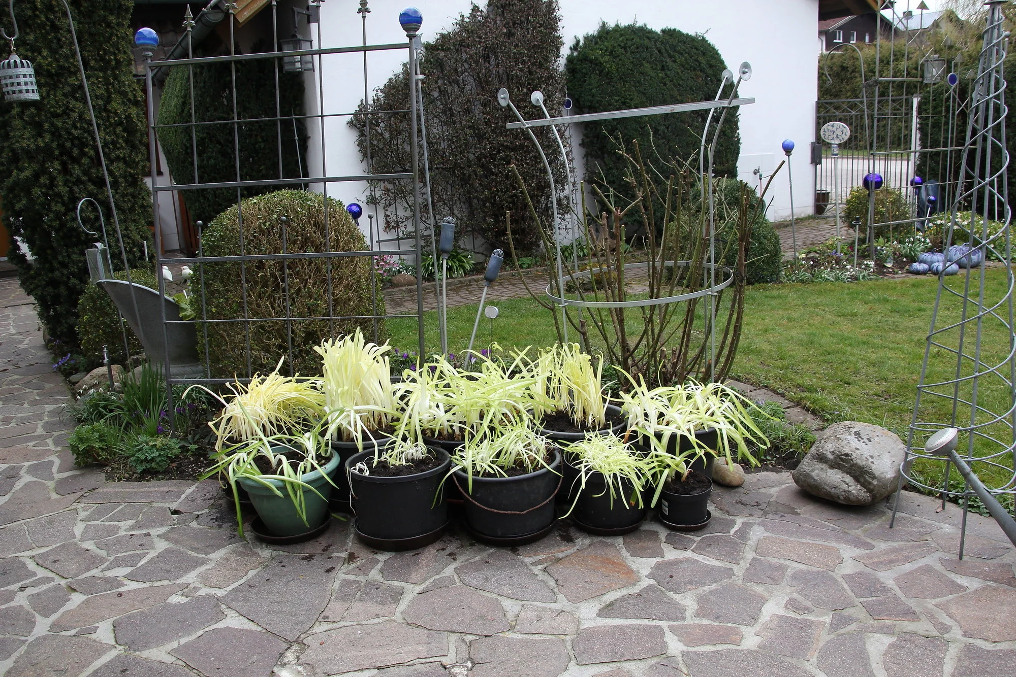 • Meine Agapanthuse stehen auch schon draußen. Die sind noch ganz hell. Sie haben den ganzen Winter keinen Tropfen Wasser bekommen und haben trotzdem so ausgetrieben. Jetzt durften sie auch raus. Gut das es bewölkt ist, so können sich die Blätter an draußen und schön langsam an das Sonnenlicht gewöhnen. Heute mache ich weiter mit Kübelpflanzen umtopfen. Meine beiden Hammersträucher, die 2 Zitrusgewächse und der Granatapfel und die 2 Fuchsien warten noch auf frische Erde. Tu auch Staphisagria C 200-Globulis ins Wasser rein, damit sie die Wurzelverletzungen besser wegstecken. Das ist Pflanzen-Homöopathie nach Mauthe. Habe damit sehr gute Erfahrungen gemacht.