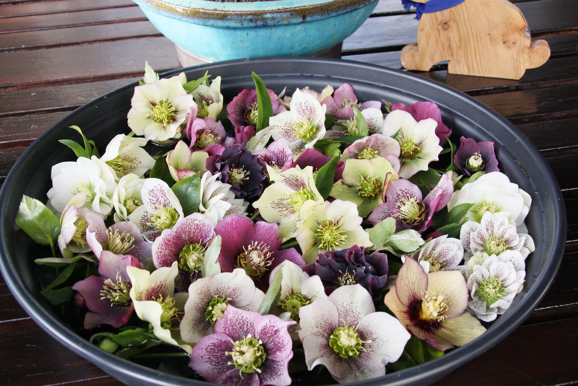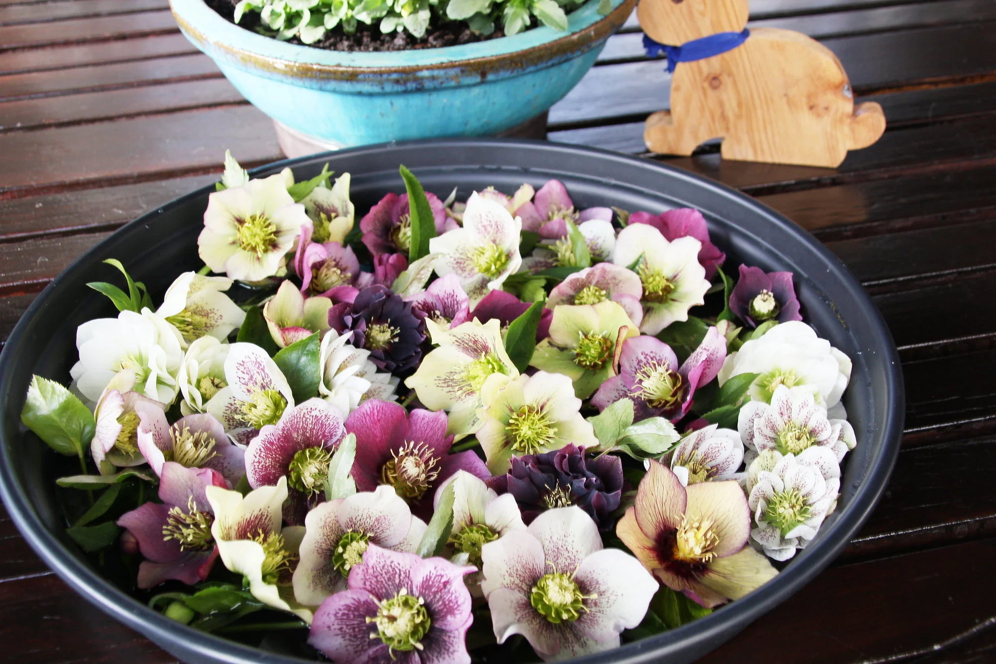 Dann habe ich noch Helleborusblüten noch in ein Tablett und in einen Untersetzer dekoriert, damit ich mal einen Teil meiner Vielfalt sehen kann. Die Leberblümchen vermehren sich auch sehr stark. Das freut mich so. Die haben jahrelang gebraucht, wie sie momentan sind.