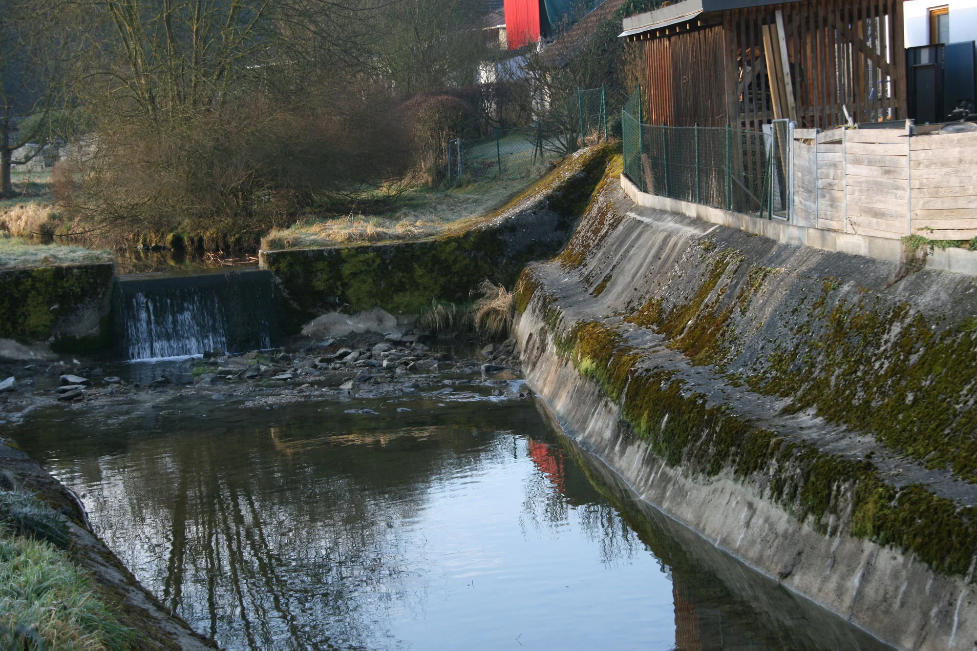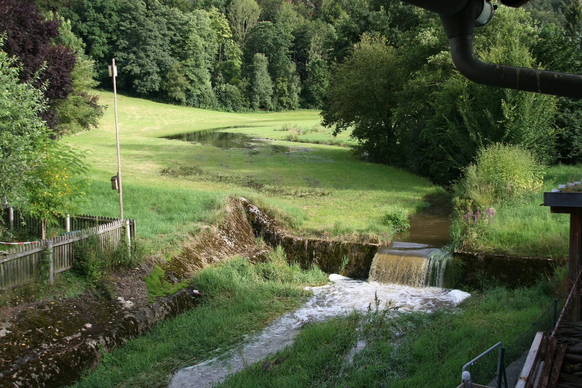 Spatzl, der Bach ist direkt hinter meinem Haus. Mein Haus ist ja schon älter, habe deshalb auch keinen Keller, der wäre immer feucht. Das ist praktisch eine Flutmulde, da sind seitlich so Betonwände. Seit ich drin wohne, seit 1972 war noch nie so ein Hochwasser, das von hinten her gekommen ist. Aber 2016 waren es nur so 3 cm , dann wäre es von hinter her in den Garten gekommen. Das war eine schlaflose Nacht für mich, schaute immer aus dem Fenster und habe beobachtet. Dann Gott sei Dank fiel der Wasserspiegel.