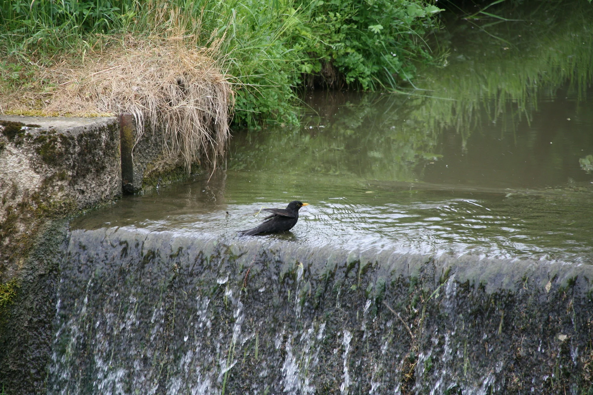 • Zur Zeit ist der Bach ja sehr zugewachsen. Da liegen an der Seite so Steine, damit die Wände nicht unterspült werden können. Da bleibt aber auch beim Hochwasser viel Erde hängen. Da wächst dann alllerhand und der Bachlauf wird dadurch immer schmäler. Das gehört mal wieder ausgebaggert. Es blüht aber auch viel hinten, der Blutweiderich, Mädesüß, wollige Karde und noch alles mögliche. Das sieht zwar schön aus wenn es blüht, aber da können die Enten kaum mehr durchschwimmen, weil der Bachlauf schon so schmal ist und dann auch die Pflanzen reinhängen.
