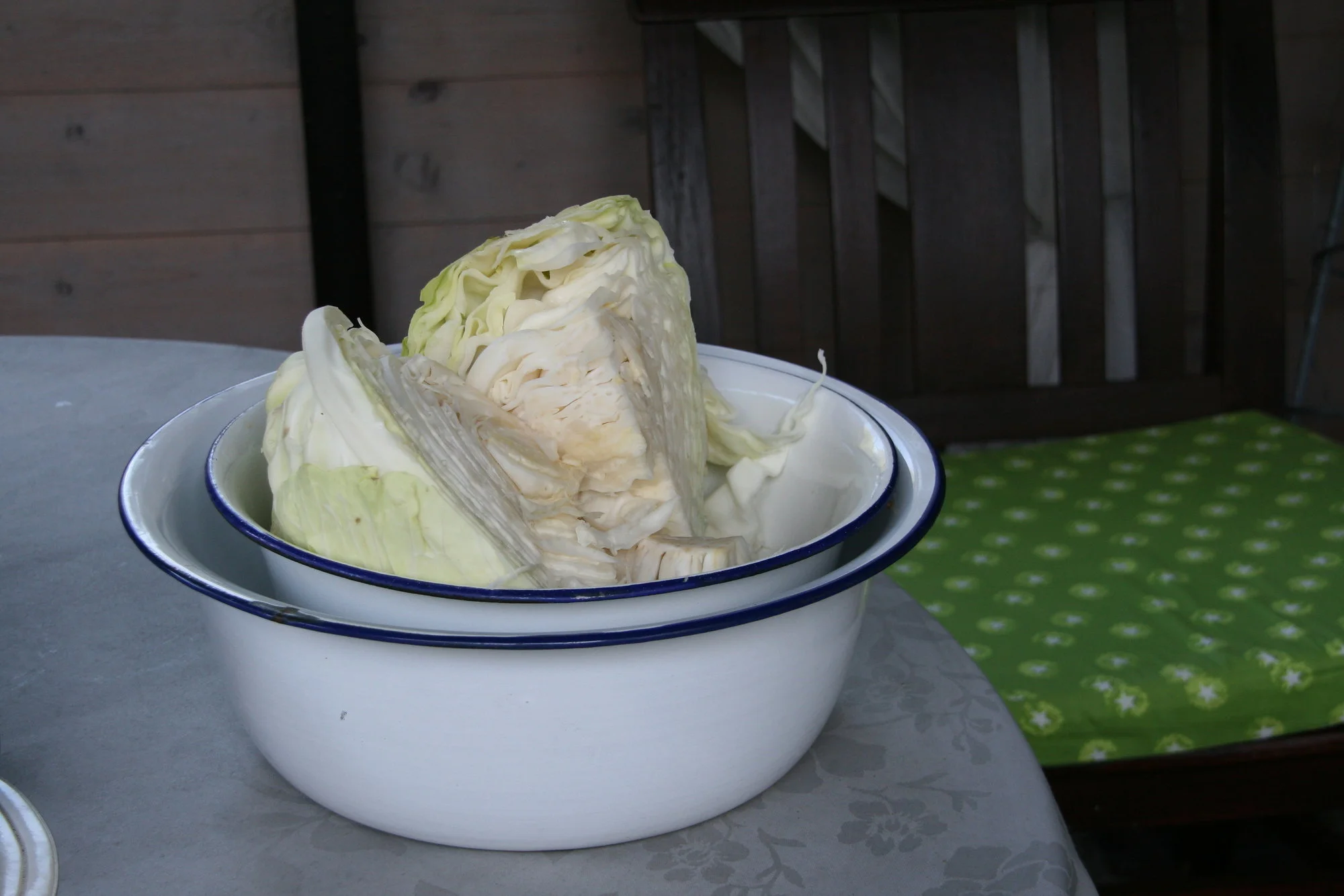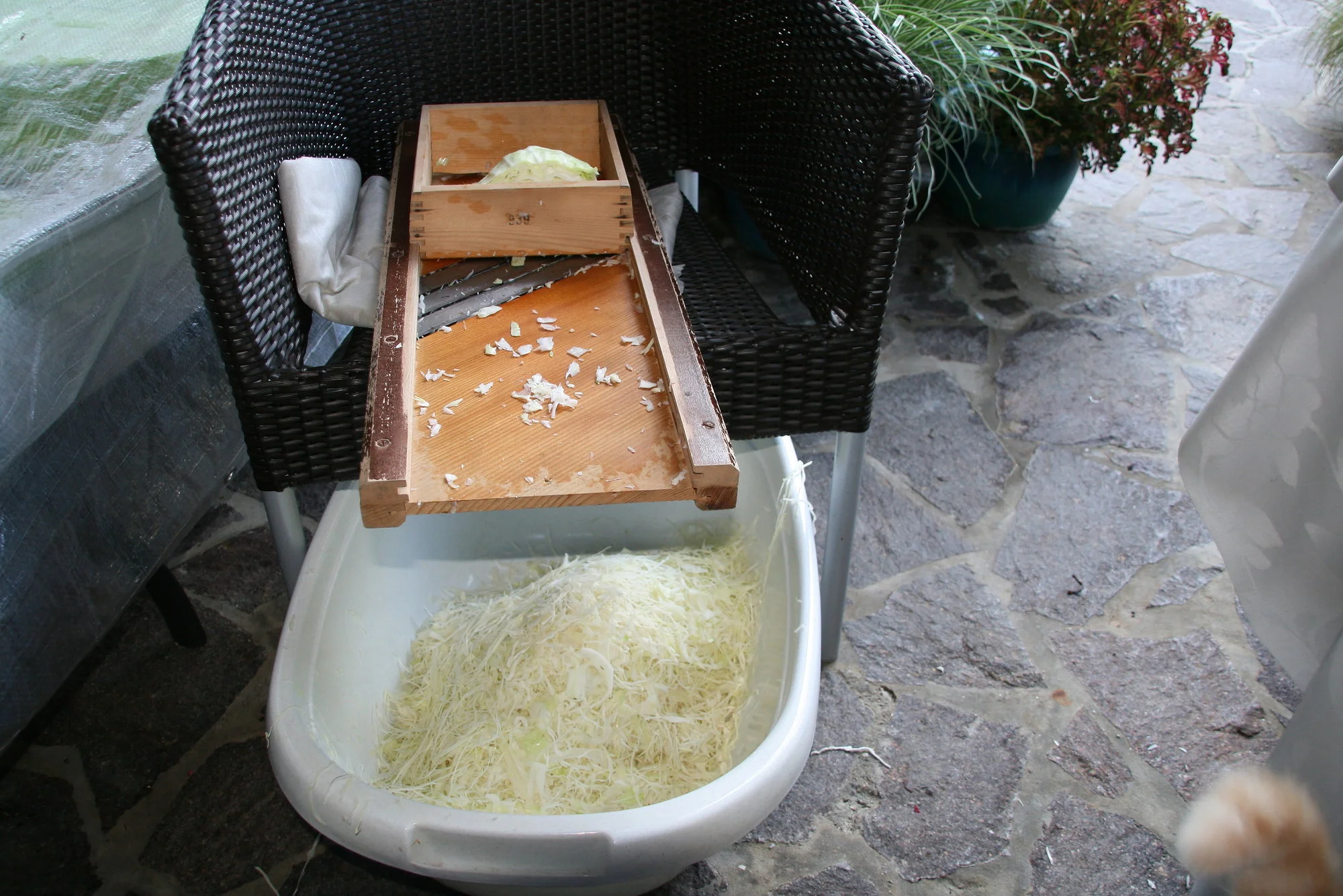 • Heute habe ich Sauerkraut eingemacht, da hat er ganz genau zugeschaut, wie ich das mache. Wahrscheinlich will er mir nächstes Jahr tatkräftig helfen ;). Habe Fotos gemacht. 5 Kg habe ich eingemacht, das wurde ein großer Topf voll. Da freue ich mich im Winter. Übern Sommer mag ich kein Sauerkraut, aber im Winter ißt man wieder gerne deftiger. Ich drücke das Kraut immer in der Schüssel, da läuft der Saft schneller, als mit dem Stampfer und es geht auch schneller.