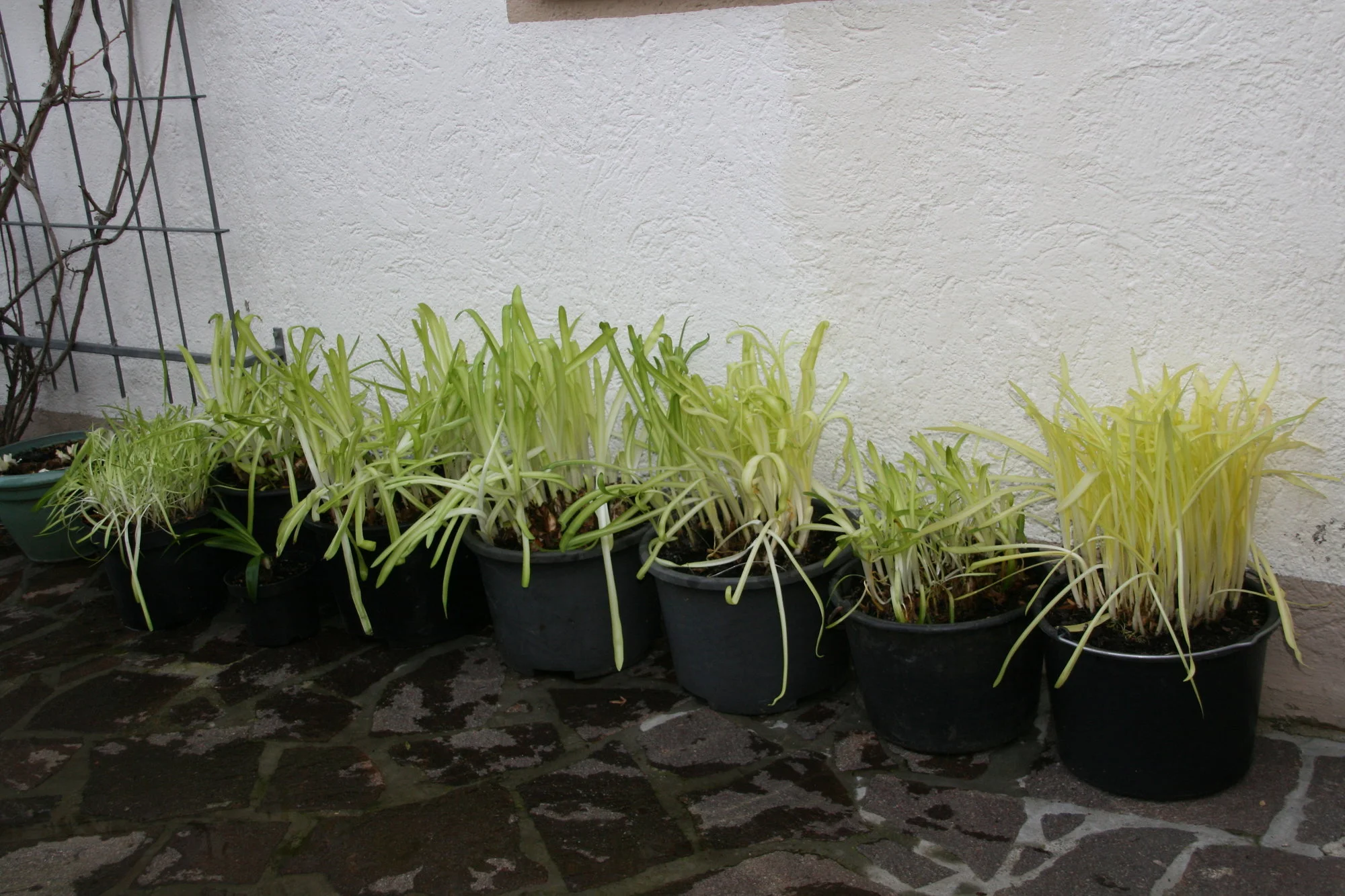 Heute habe ich meine Agapanthuse rausgestellt. Sie sehen noch sehr bleich aus, es ist der Lichtmangel. Sie stehen im Schatten und nachts decke ich sie mit Vlies zu. Dann habe ich sie gründlich gewässert. Jetzt können sie sich schon mal moralisch auf den Sommer vorbereiten.