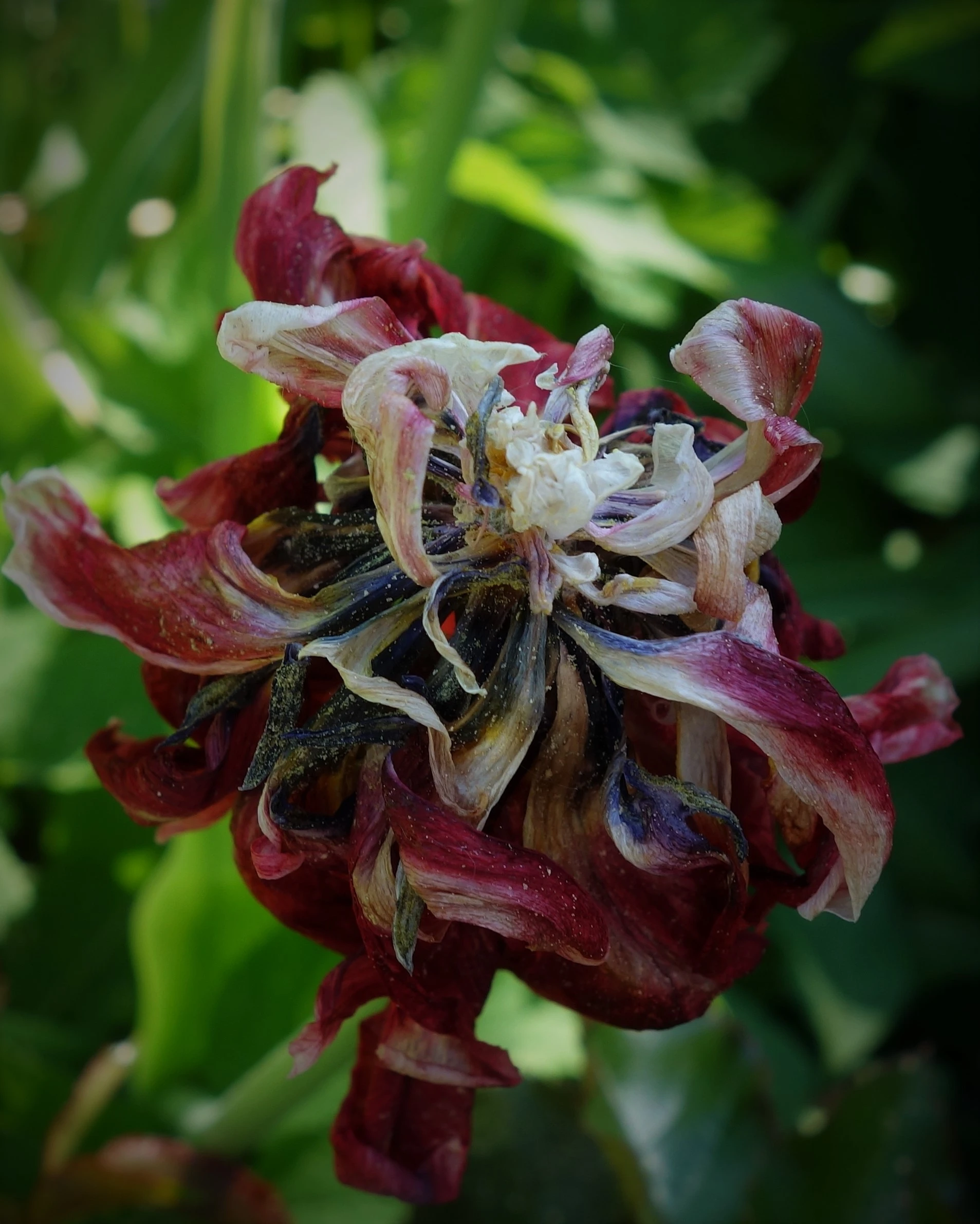 Es wundert mich, dass im Verblühen so viele Farben zum Vorschein kommen. :d Wenn man zum Vergößern klickt, sieht man, dass das eine etwas zirkushafte Tulpe ist.