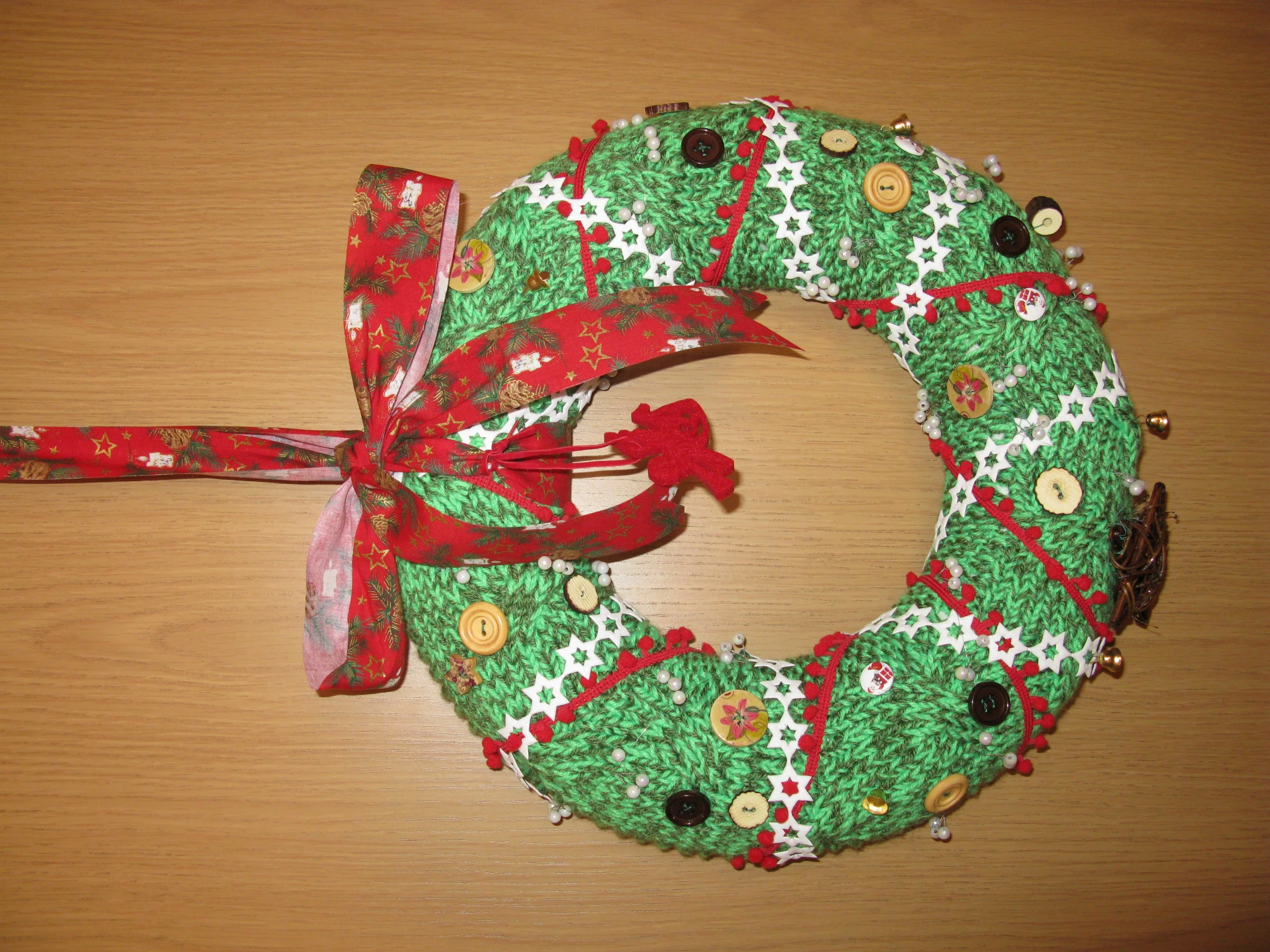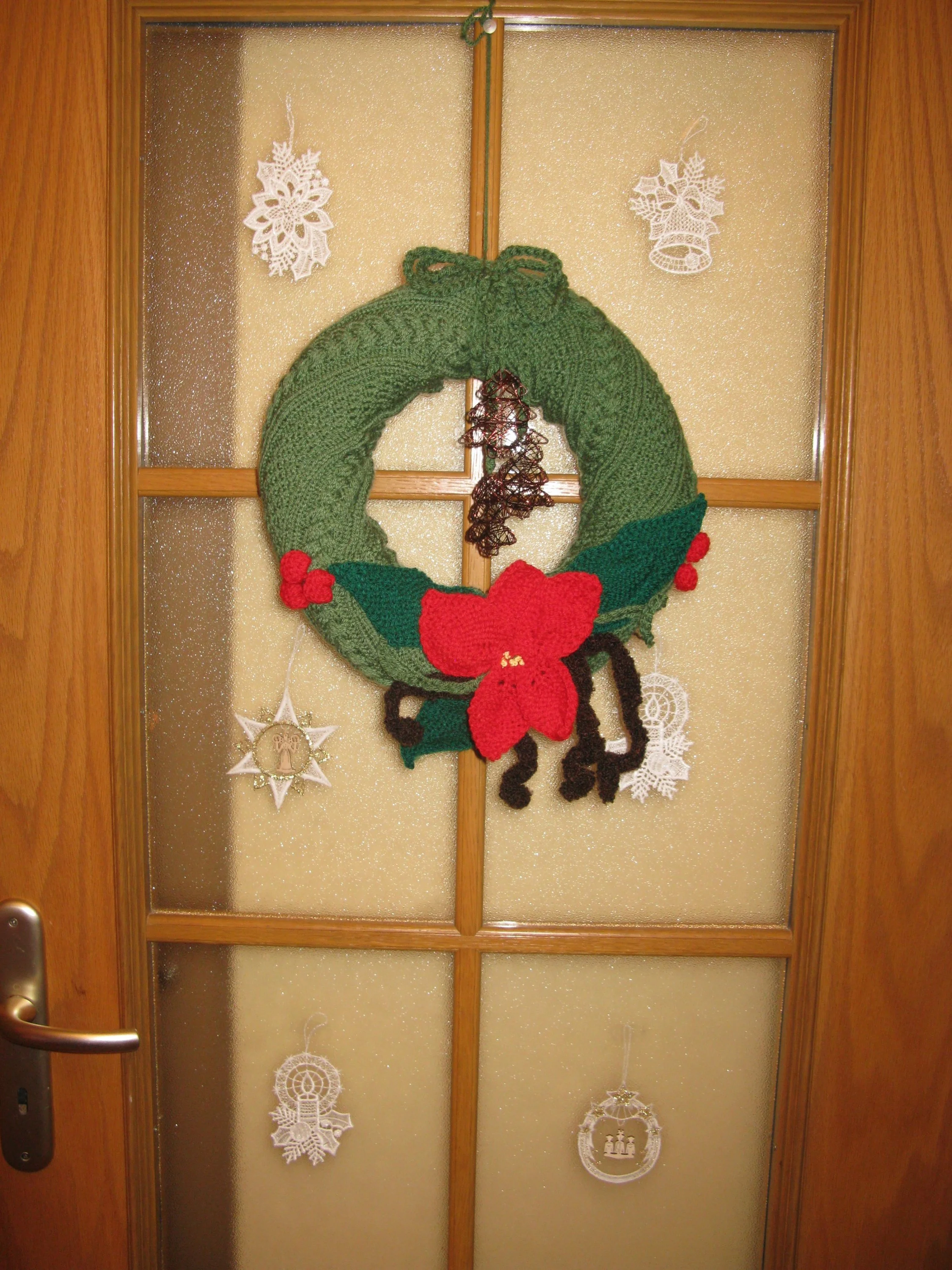 • Sind beide gestrickt und ja darunter versteckt sich ein Kranz. Es sind aber welche aus Styropor, sind leichter und nur halbe Ringe. Die Idee hatte ich aus einer Handarbeitszeitschrift.