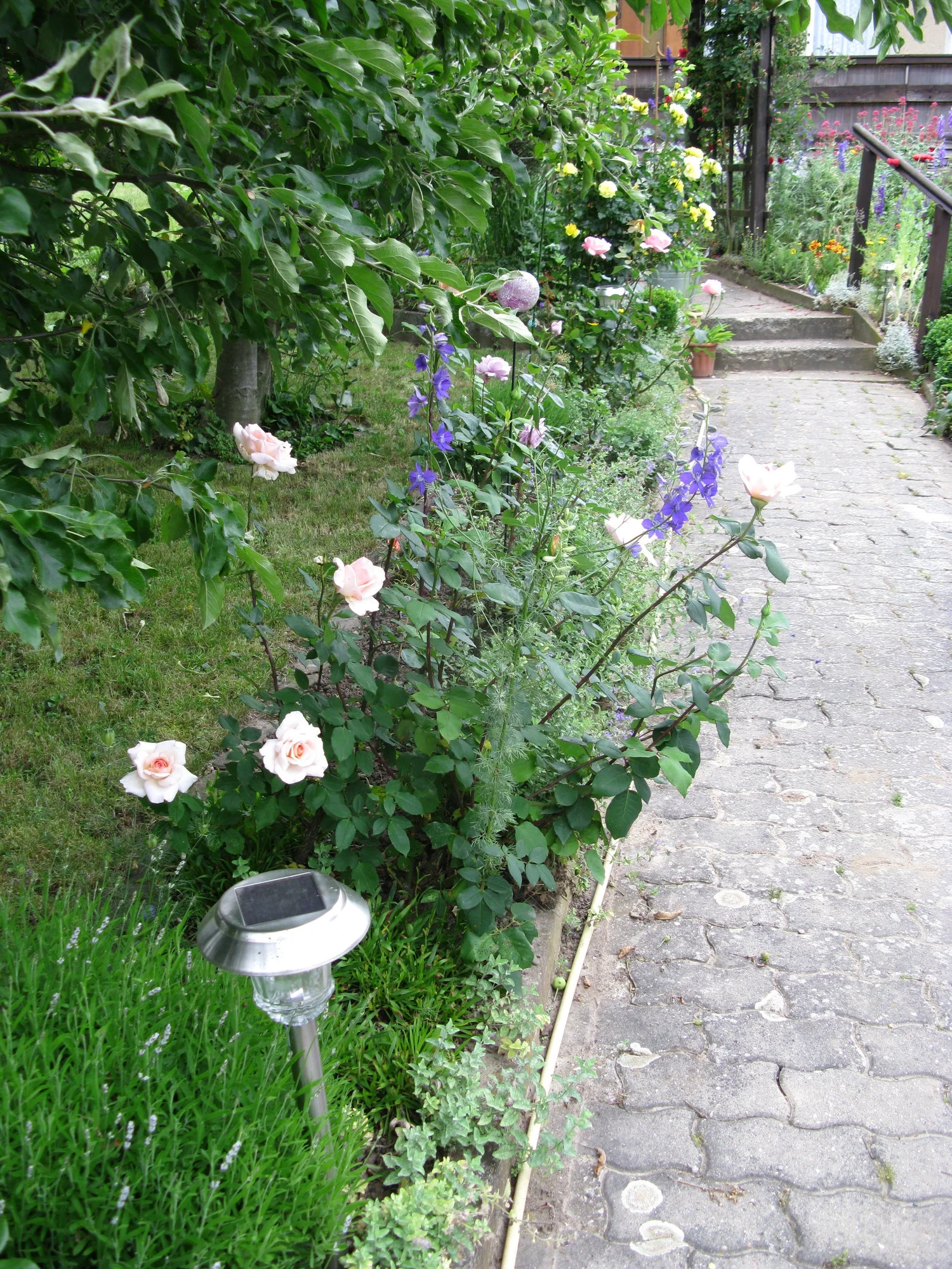 Auf 4 Meter habe ich nun auch die Wurzeln vom Buchs entfernt und es stehen nur noch zwei hoch stämmige Buchskugeln. Dazwischen habe ich einen Muskatellersalbei, Rittersporn und Sonnenbraut gepflanzt.