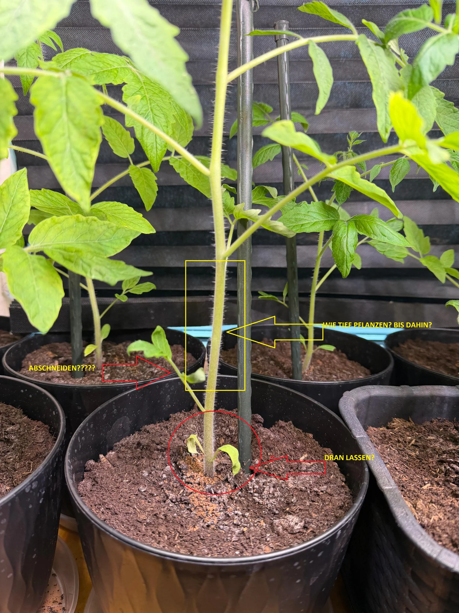 1: Wie tief pflanzen? Auf den Bildern sieht man ja ganz unten die zwei einsamen Blätter, soll ich diese abschneiden und dann den noch tiefer einpfanzen bis zu den nächsten Blättern? Ich habe mir schon 30cm Töpfe bestellt, die kommen am Donnerstag oder Freitag oder wie tief soll ich da einpflanzen? Die Stängel sind ja schon sehr lang...