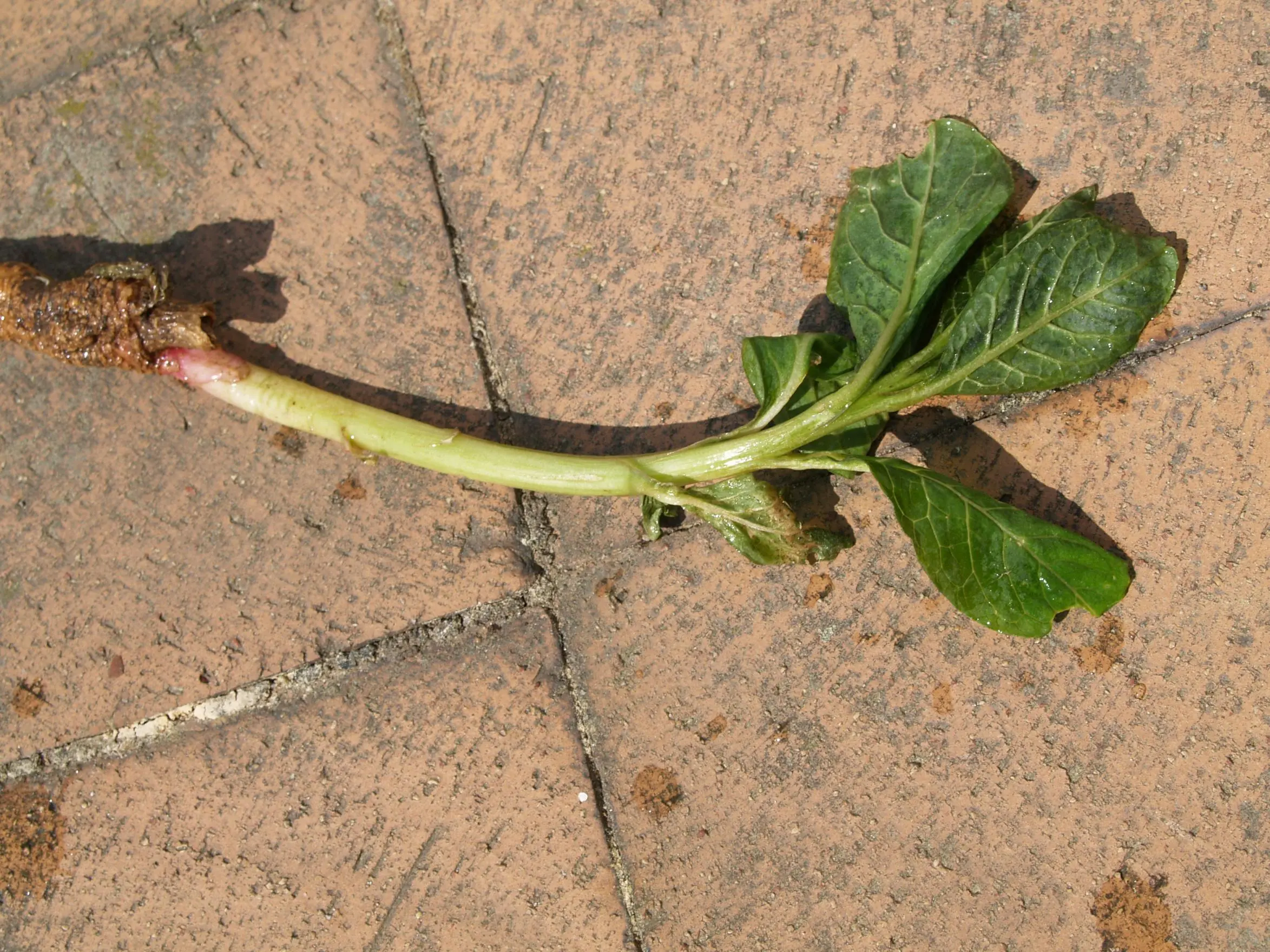 Die Wurzel ist fest wie eine Möhre und die Blätter sind oval und kreisförmig ums Zentrum angeordnet.