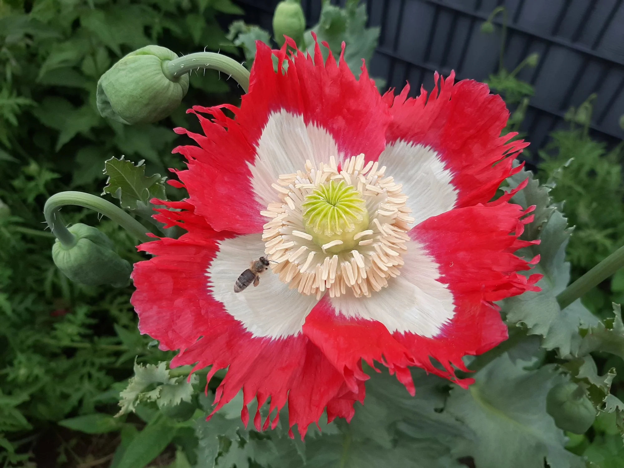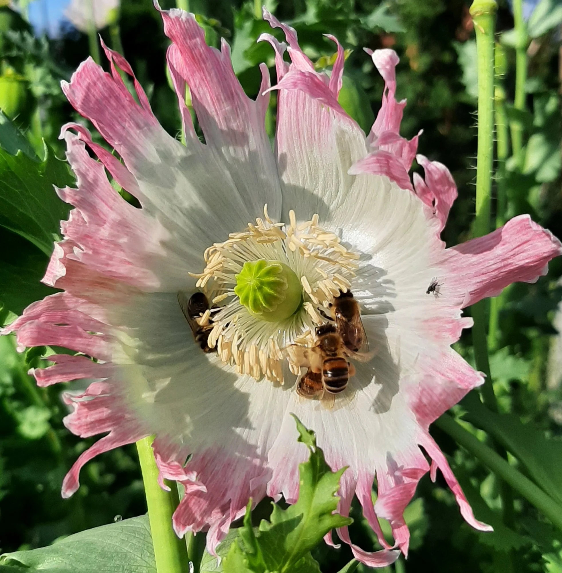 Mohn, ist meine Lieblingspflanze. Ich habe diverse Sorten, müßten mittlerweile über 20 sein. Es ist aber nicht leicht, sie sortenrein zu halten. An der weissen Burma, sitzen 8 Bienen, neuer Rekord. Die andere ist Kreuzung aus Galania und Burma.