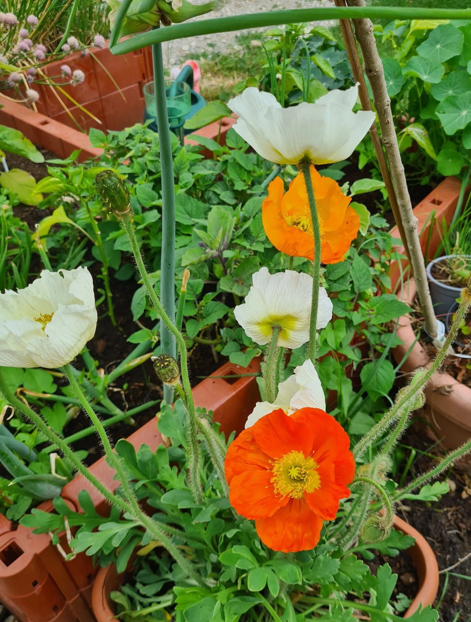 • Ich hatte mal eine Mohnstraße, das war 2019. Beim Komposthaufen gingen in den Pflasterritzen soviel Pflanzen auf. Ich ließ sie wachsen, damit ich sah was das für Sorten sind. Konnte dann nicht mehr mit dem Schubkarren durch. wie sie verblüht sind, habe ich sie ausgerissen. Das war auch schön anzuschauen. Heuer habe ich fast keinen Mohn, leider.