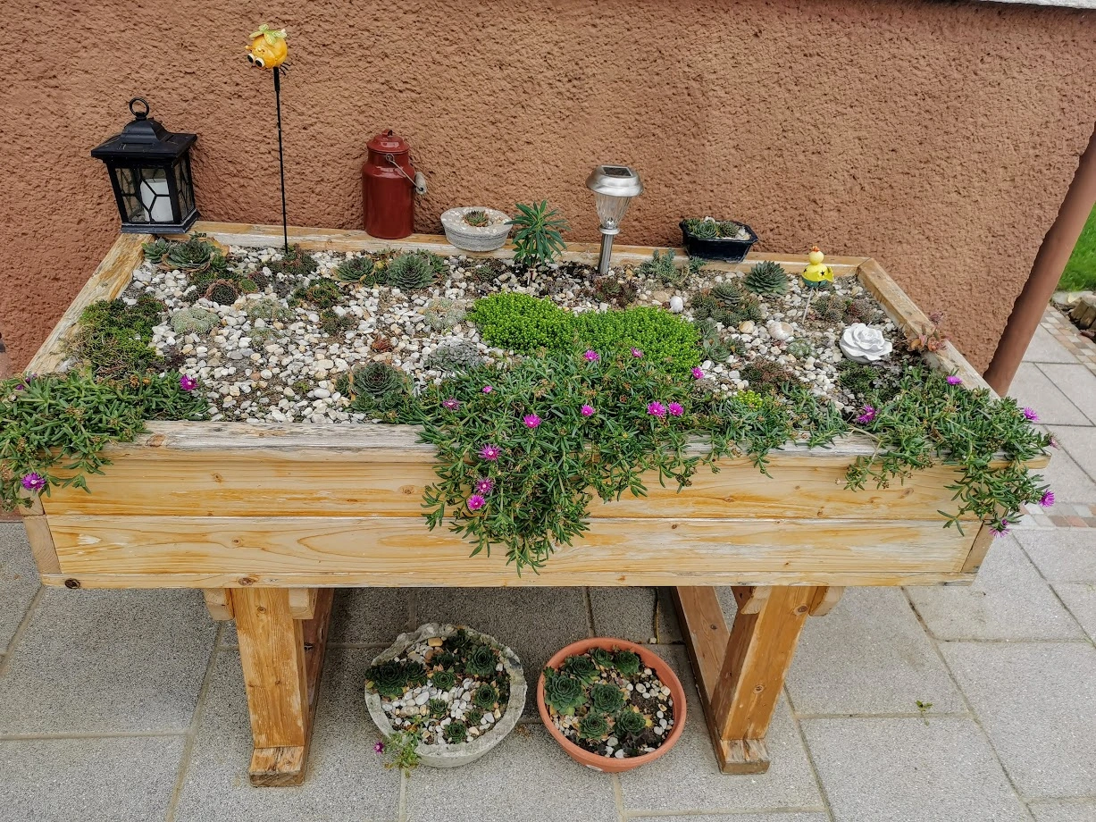 Was das Hauswurzenbeet angeht - das Problem ist nämlich - wie bewegen wir dieses Tischbeet an den vorgesehenen Platz??