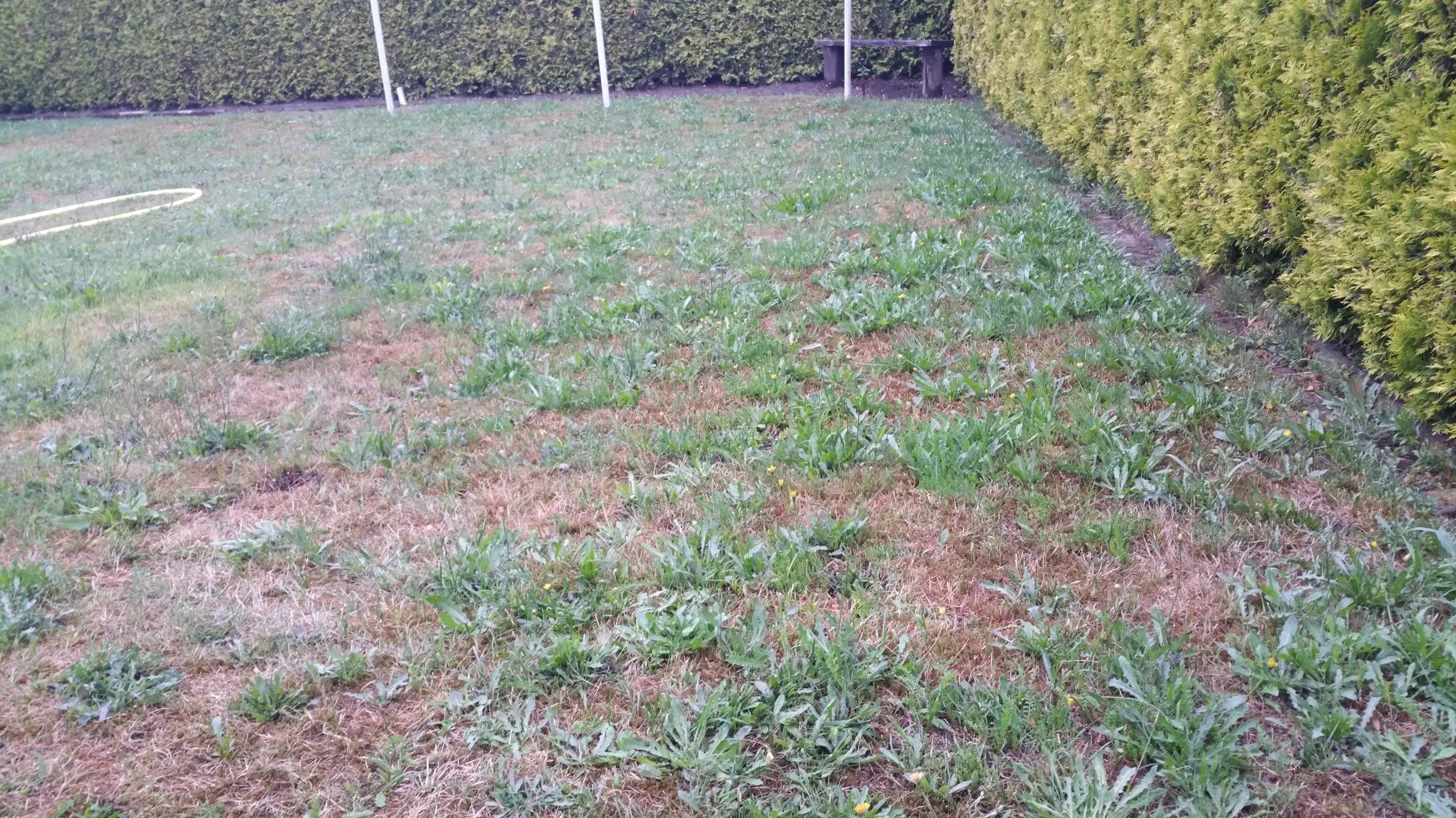 Ab dann regelmäßig (!) mähen, wässern und düngen, dann dürfte die Fläche auch wieder grün werden.