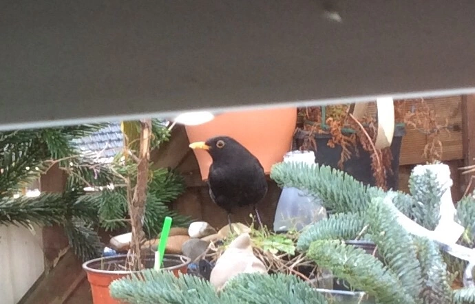 Ich bin dann raus, um aufzuräumen, da saß dann schon eine Amsel auf dem Sichtschutz um sich zu positionieren, den besten Platz auszusuchen....