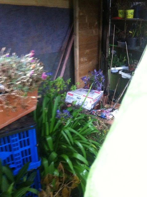 Mein neu erbautes Winterquatier hat die Fenster verloren, aber zum Glück nach innen gedrückt und nicht kaputt. Witzig, meine Agapanthus blüht immer noch und das in dem Chaos...