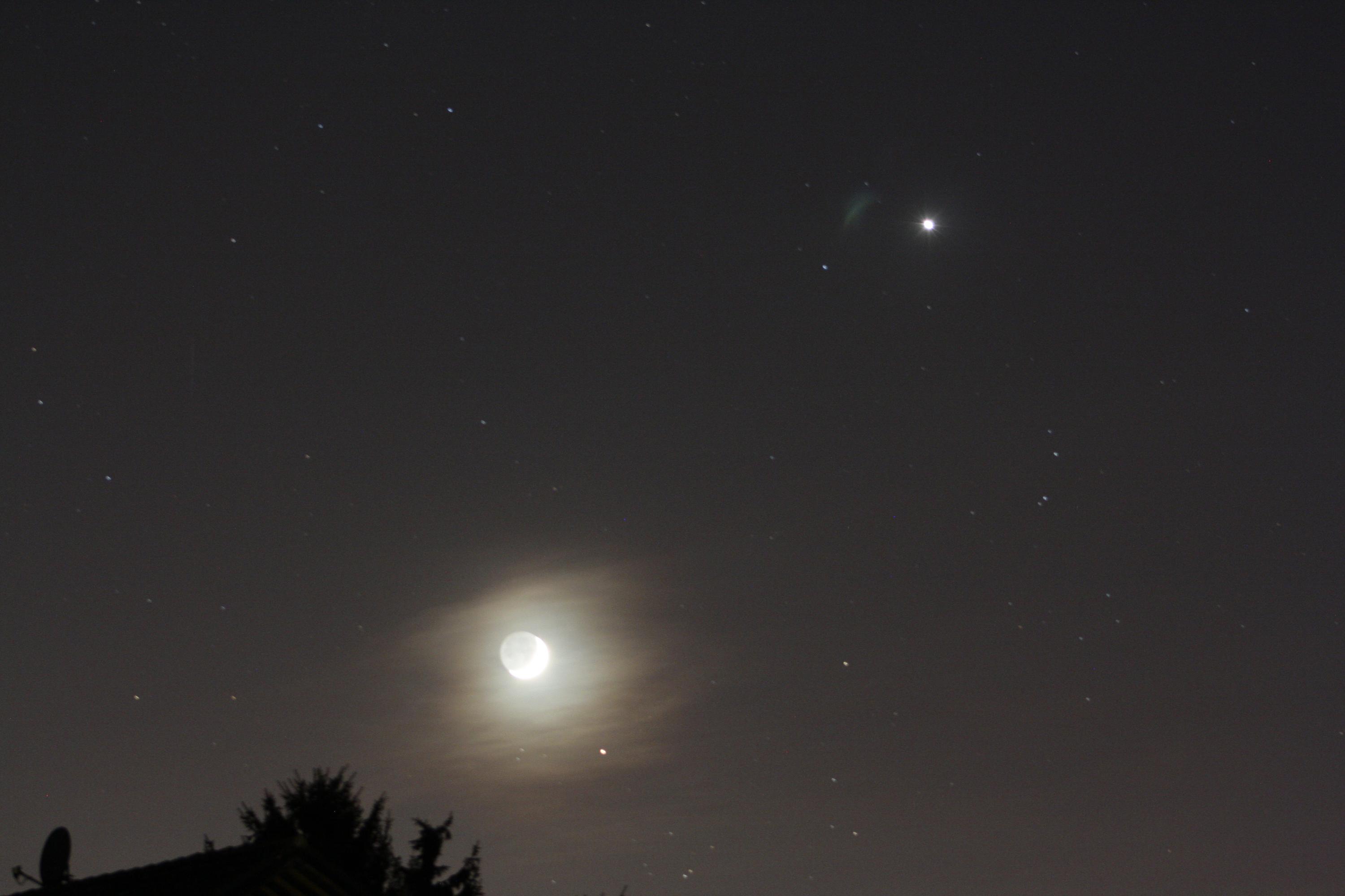 Mond , Aldebaran auf "16:30 Uhr" (ein roter Riese im Sternbild Stier) und rechts oben die strahlende Venus..