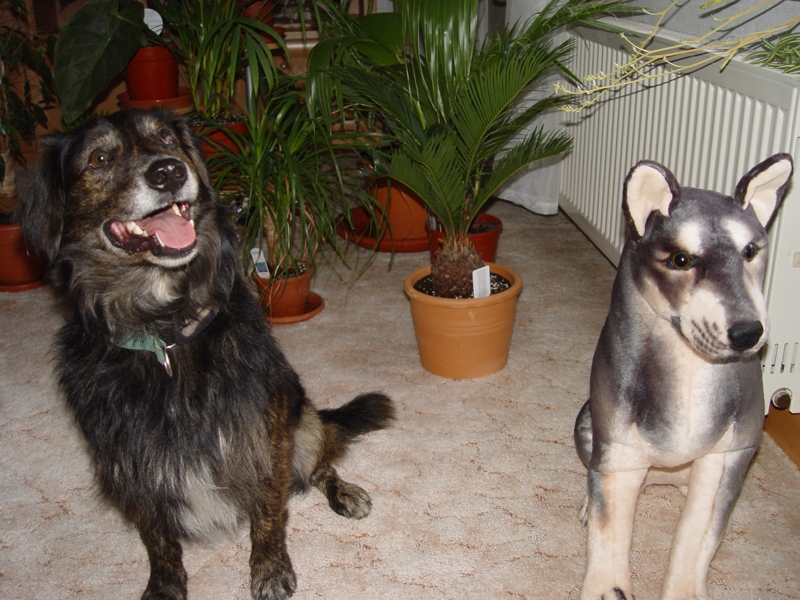 ps: das andere bild habe ich gerade gesucht und wieder gefunden, ist schon ein paar jahre alt, das pendant aus der plüsch und husky-fraktion (zumindest nehme ich an, das soll einen husky vorstellen - war während einer vorkontrolle). mein alter herr billy (mittlerweile noch älter, aber immer noch fit) sieht richtig aus, als hätte was davon abgefärbt. dabei hat er wohl eher pudel in sich drin und vielleicht noch einen münsterländer...und ansonsten alles, was noch so in seiner straße wohnte :D husky wahrschjeinlich eher nicht :D