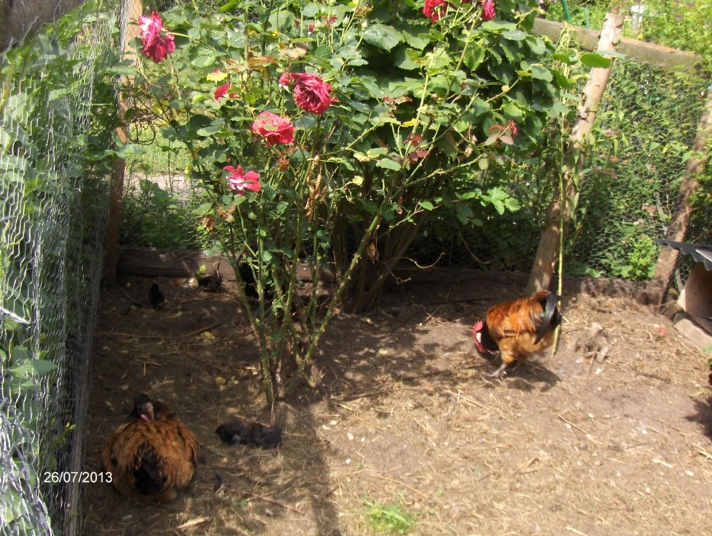 So ich habe das Experiment gewagt und den Papa von den 5 Küken insgehege gelassen er war vor Sehnsucht nach seinen Henen doch etwas geknickt und siehe da er hat sofort los gelegt und rosenblätter für die Hennen und sogar für die Küken gepflückt und ihnen vor die Füsse gepackt