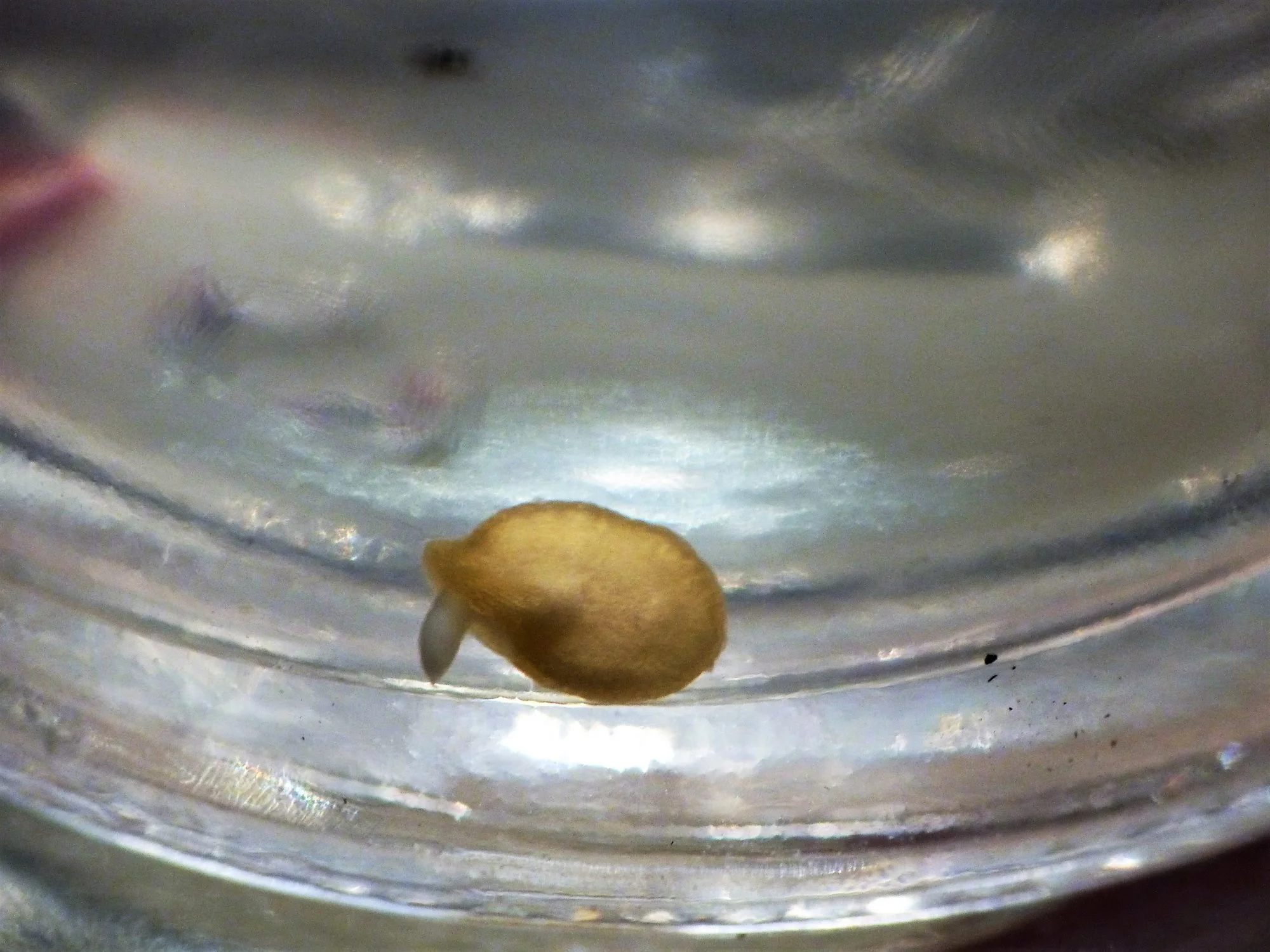 Schaut mal, das eine Sämchen, was ich probeweise in's Wassergläschen geschmissen hatte, streckt ein Beinchen raus. Endlich! Was mache ich jetzt mit ihm? Auch in Anzuchterde oder gleich richtige?