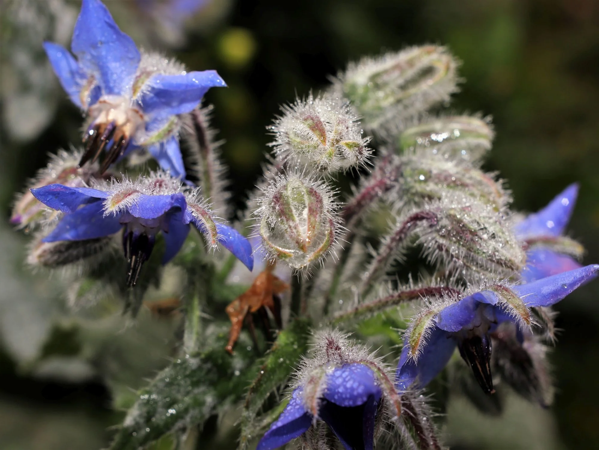 Das erste Wiesenfoto zeigt Borretsch. Der ist dort sehr üppig und ziemlich groß gewachsen. Im Gegenlicht und von unten, da die Blüten sowieso alle hängen...