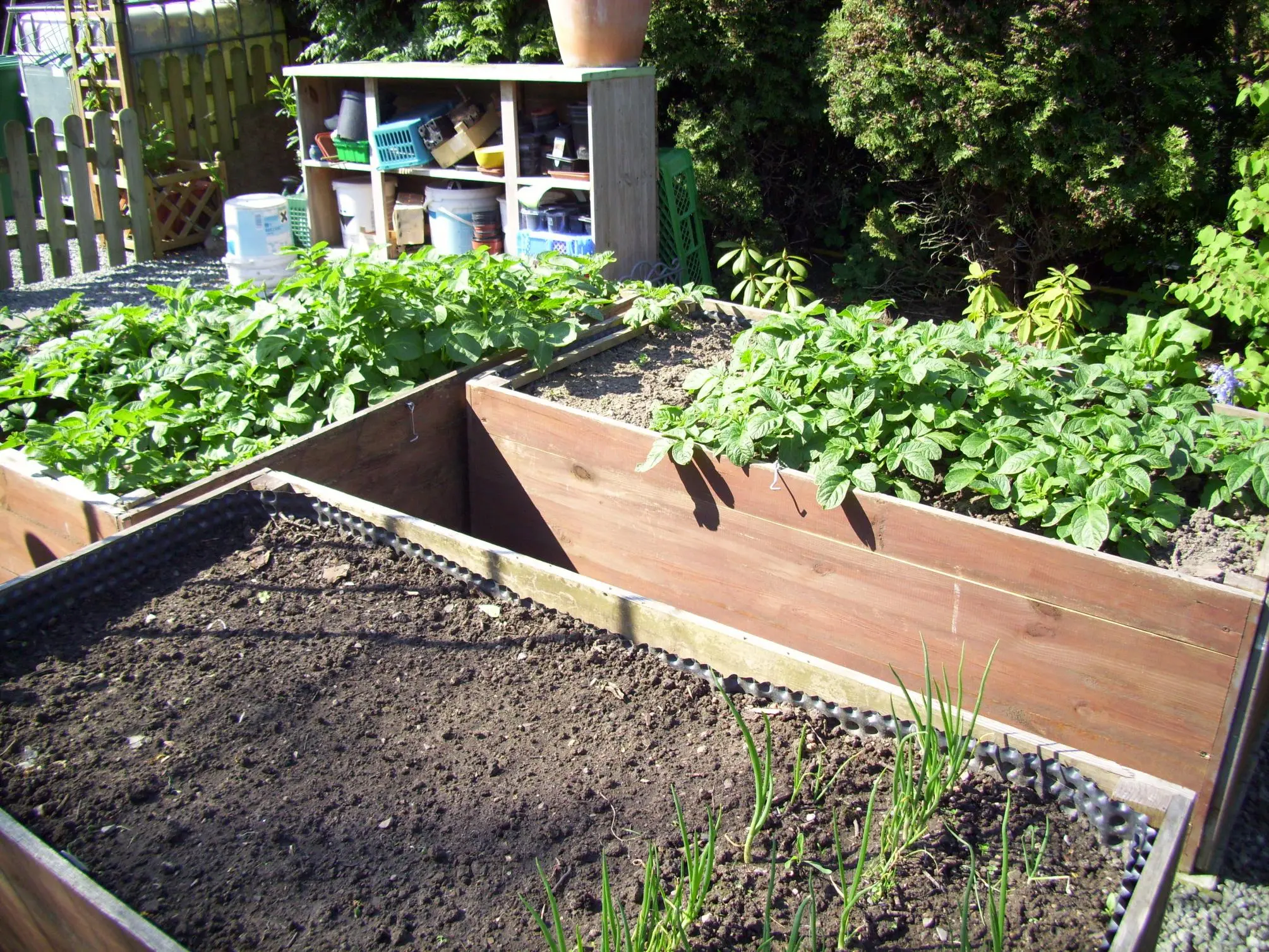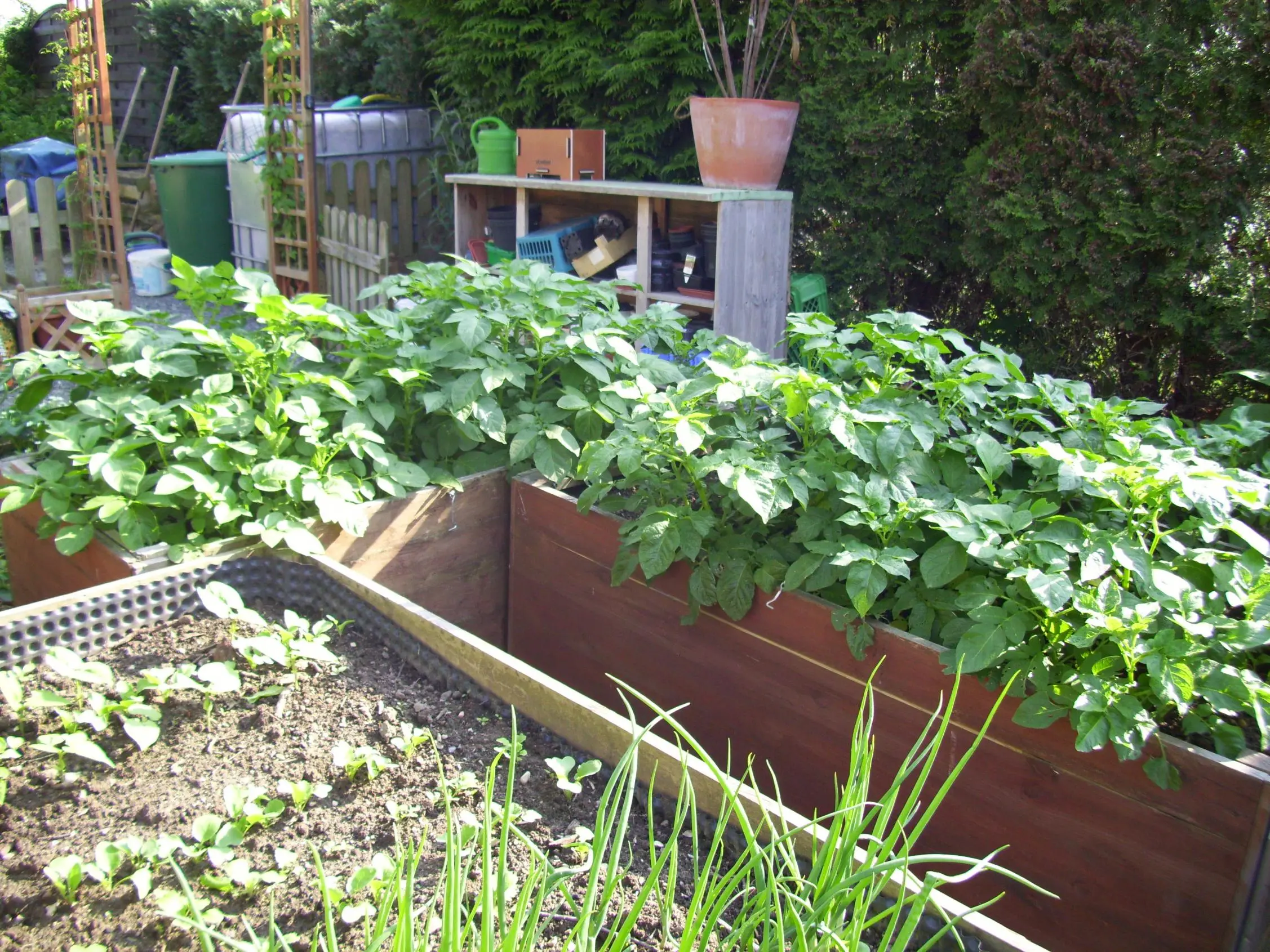Die Kartoffeln im Hochbeet kommen gut, auch die im Freiland.